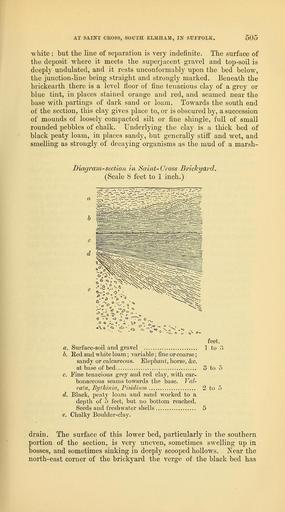Keywords: The Quarterly journal of the Geological Society of London (13937325291).jpg AT SAINT CROSS SOUTH ELMHAM IN SUFFOLK 507 <br> Aim is glutinosa L <br> Ceratophyllum demersum L <br> Alisma plantago L <br> Potainogeton heterophyllus <br> Schreb <br> perfoliatus L <br> crispus L <br> obtusifolius Mert § ¢ Koch <br> trichoides Cham <br> Zannichellia palustris L <br> Scirpus pauciflorus Light/ <br> Cfflspitosus L <br> fluitans L <br> lacustris L <br> Carex riparia Curtis <br> rostrata Stokes <br> Prom the same sample Mr Reid obtained two mosses which <br> Mr Mitton has declared to be ” <br> Brachythecium plumosum t <br> Amblystegium fluitans <br> And also the following Mollusca ” <br> Pisidium arnnicum Miill <br> a fragment <br> fontinale Brap <br> Tbalictrum flavum L <br> Ranunculus aquatilis L <br> sceleratus L <br> flanimula L <br> Crataegus oxyacantba L <br> Myriopbyllum spicatum L <br> Hippuris vulgaris L <br> Hydrocotyle vulgaris L <br> CEnantbe pbellandrium Lam <br> very small <br> Cnicus palustris HoffmP badly <br> preserved <br> Taraxacum officinale Web <br> Menyanthes trifoliata L <br> Lycopus europaeus L <br> Eumex maritimus L <br> Limnsea stagnalis L <br> Valvata piscinalis Mull <br> Bytbinia tentaculata L <br> Spbasrium corneum L <br> Some minute teeth and bones of vertebrates were also found <br> which Mr Newton has verified as ” <br> Arvicola sp vole Tinea vulgaris tench <br> Leuciscus rutilus roach Esox lucius pike <br> The same stratum contains abundance of wood and some time <br> ago the trunk and main branches of a forest tree Mr Aldous says <br> an oak were found imbedded in the loam <br> rTo palaeolithic implements were found at Saint Cross though <br> flint flakes and drippings more or less suggestive of human agency <br> are common in bed b On a recent visit to the brickyard a work- <br> man gave me a small cast bronze or copper adze which he had <br> obtained some years ago from bed c into which possibly it had <br> fallen from the surface of the section t I may mention here that <br> when the present series of excavations at Saint Cross was begun <br> it was found that the brickyard had been tenanted before by an <br> older generation of workmen A kiln filled with wood-ashes and <br> of a long obsolete pattern which had been completely buried and <br> grassed over was dug out and a quantity of abandoned brickearth <br> washed and utilized <br> Mr Reid seems to have found no trace of the hawthorn in any of tbe <br> postglacial deposits be bad previously examined See bis Notes on the <br> Geological History of tbe Recent Flora of Britain Annals of Botany vol ii <br> no 6 August 1888 <br> t Tbis species does not appear in tbe Rev E IS Bloonifield's list of the <br> mosses of Suffolk ” ' Journal of Botany ' August 1885 and March 1888 It is <br> usually found in Subalpine districts growing upon rocks and stones in damp <br> places Berkeley <br> j The Rev C R Manning F S A informs me that tbis implement is the <br> blade of a socketed celt broken off at tbe base of tbe socket of the common <br> type described by Dr Evans in Chap V of bis ' Ancient Bronze Implements ' 36940336 113696 51125 Page 505 Text 45 http //www biodiversitylibrary org/page/36940336 1889 Geological Society of London NameFound Alisma plantago NameConfirmed Alisma plantago NameBankID 1671647 NameFound Amblystegium fluitans NameConfirmed Amblystegium fluitans NameBankID 3334297 NameFound Arvicola NameConfirmed Arvicola EOLID 111244 NameBankID 2480523 NameFound Brachythecium plumosum NameConfirmed Brachythecium plumosum EOLID 862768 NameBankID 3872616 NameFound Carex riparia NameConfirmed Carex riparia EOLID 1123478 NameBankID 2777989 NameFound Ceratophyllum demersum NameConfirmed Ceratophyllum demersum EOLID 596653 NameBankID 2645283 NameFound Cnicus palustris NameConfirmed Cnicus palustris L Willd EOLID 468314 NameFound Crataegus NameConfirmed Crataegus EOLID 29927 NameBankID 2649819 NameFound Esox lucius NameConfirmed Esox lucius EOLID 206652 NameBankID 3863621 NameFound Hippuris vulgaris NameConfirmed Hippuris vulgaris EOLID 583132 NameBankID 2651056 NameFound Hydrocotyle vulgaris NameConfirmed Hydrocotyle vulgaris EOLID 596968 NameBankID 2663367 NameFound Leuciscus rutilus NameConfirmed Leuciscus rutilus EOLID 11088833 NameBankID 3861153 NameFound Lycopus europaeus NameConfirmed Lycopus europaeus EOLID 579749 NameBankID 2654982 NameFound Menyanthes trifoliata NameConfirmed Menyanthes trifoliata EOLID 584945 NameBankID 2653291 NameFound Mollusca NameConfirmed Mollusca EOLID 2195 NameBankID 230454 NameFound Pisidium NameConfirmed Pisidium EOLID 50249 NameBankID 2693599 NameFound Ranunculus aquatilis NameConfirmed Ranunculus aquatilis EOLID 473801 NameBankID 2645415 NameFound Scirpus pauciflorus NameConfirmed Scirpus pauciflorus R Br Poir EOLID 1119068 NameFound Taraxacum officinale NameConfirmed Taraxacum officinale EOLID 578234 NameBankID 2657720 NameFound Tinea vulgaris NameConfirmed Tinea vulgaris NameFound Valvata piscinalis NameConfirmed Valvata piscinalis EOLID 12003293 NameBankID 2683198 NameFound Zannichellia palustris NameConfirmed Zannichellia palustris EOLID 1116008 NameBankID 2659791 Biodiversity Heritage Library The Quarterly journal of the Geological Society of London v 45 1889 Geology Periodicals Smithsonian Libraries bhl page 36940336 dc identifier http //biodiversitylibrary org/page/36940336 smithsonian libraries Information field Flickr posted date ISOdate 2014-04-21 Check categories 2015 August 26 CC-BY-2 0 BioDivLibrary https //flickr com/photos/61021753 N02/13937325291 2015-08-26 05 51 35 cc-by-2 0 PD-old-70-1923 The Quarterly journal of the Geological Society of London 1889 Photos uploaded from Flickr by Fæ using a script |