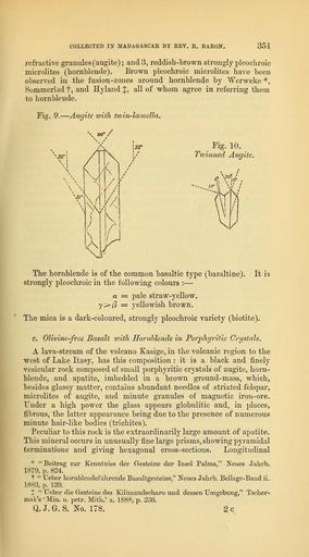 | Keywords: The Quarterly journal of the Geological Society of London (13937225462).jpg COLLECTED IN MADAGASCAR BY REV R BAROtf 353 <br> yellow in colour Its crystals are remarkably well contoured ; they <br> are bounded by faces out of the prismatic zone terminated by a <br> dome or hemipyramid <br> Large pseudomorphs after hornblende occur sporadically They <br> are crowded with minute cubes of iron-ore distributed uniformly <br> through the crystal-section see fig 11 Between crossed nicols <br> Fig 11 ” Fused Hornblende-crystal recrystallized as Magnetite <br> and Augite in Magma-basalt X 70 <br> they usually give aggregate-polarization The polarizing substance <br> resembles augite probably produced by a melting-down of the <br> hornblende substance <br> A few grains of quartz similar to those already described are met <br> with occasionally The corroded grains are surrounded by a zone <br> of colourless glass containing augite-microlites ; this is succeeded by <br> a second zone of brown glass containing microlites and crystals of <br> augite together with granules of magnetite see fig 12 <br> Fig 12 ” Quartz-grain melted down and surrounded by light and <br> dark zones of Glass ivith Augite-microlites <br> The amount of glass increases in certain parts of the rock The <br> elongated shape of these more yitreous portions points to fluidal <br> movements during the hardening of the rock The central portions <br> of these patches are often filled with a network of minute opaque <br> trichites crossing one another at angles of 60° 90° and 120° fig 13 <br> Felspar-free basalts or magma-basalts Boficky have a wide-spread <br> occurrence They have been described for instance from the <br> Kaiserstuhl Rosenbusch the Ehon and Vogelsberg Bucking <br> 2c2 36940166 113696 51125 Page 351 Text 45 http //www biodiversitylibrary org/page/36940166 1889 Geological Society of London Biodiversity Heritage Library The Quarterly journal of the Geological Society of London v 45 1889 Geology Periodicals Smithsonian Libraries bhl page 36940166 dc identifier http //biodiversitylibrary org/page/36940166 smithsonian libraries Information field Flickr posted date ISOdate 2014-04-21 Check categories 2015 August 26 CC-BY-2 0 BioDivLibrary https //flickr com/photos/61021753 N02/13937225462 2015-08-26 05 52 28 cc-by-2 0 PD-old-70-1923 The Quarterly journal of the Geological Society of London 1889 Photos uploaded from Flickr by Fæ using a script |
