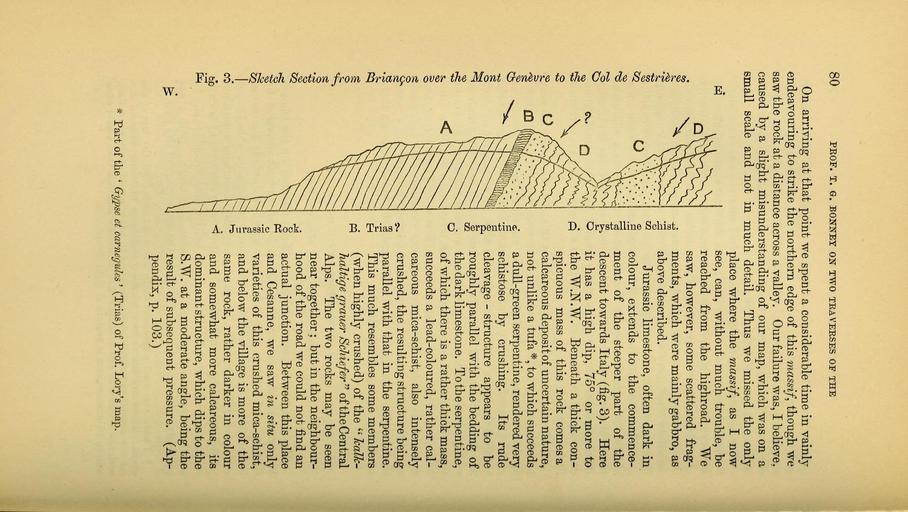 | Keywords: The Quarterly journal of the Geological Society of London (13936963171).jpg 82 PROF T G BONNET ON TWO TEAVEESES OE TEE <br> base of the hill crowned by the celebrated forts is a felspar-acti- <br> nolite rock possibly of igneous origin followed by mica-schist <br> and a dull green rock banded with epidote dipping much as before <br> The rock in this neighbourhood is stronger and less easily weathered <br> than that higher up the valley and recalled to my mind some of <br> Fig 4 ” Diagram of ' stratification-foliation in Calc-mica-schist <br> near Col cle Sestrie r res <br> The lines roughly indicate micaceous layers ; the long arrow is parallel with <br> the cleavage-foliation of the mass ; the small arrow shows the place <br> where a specimen was taken for examination p 103 <br> the chloritic and micaceous rocks about Zermatt or near St Vincent <br> in the Yal d'Aoste f Below Fenestrelle this change in character <br> becomes yet more marked The rocks now are more massive form- <br> ing bolder crags which are no longer masked by a talus of shivery <br> schist ; in short the same change in the scenery may be observed <br> Consists chiefly of epidote actinolitic hornblende quartz felspar and hsema- <br> tite with some sphene and rutile The microscopic structure is interesting in <br> many ways but it is enough for my present purpose to say that subsequent <br> mineral rearrangement has made it difficult to be sure of the original condition <br> of the rock but I think that it probably was igneous and that pressure has not <br> been the sole agent of change <br> t Minerals quartz epidote mica white and brown chlorite probably in <br> part at least replacing the latter garnet red a little rutile and a colourless <br> doubly refracting mineral of ill-defined limit and form probably allied to zoisite <br> or epidote The rock is distinctly foliated and banded The constituents <br> especially the white mica are fair-sized and well defined as if freely formed ; so <br> if the foliation results from pressure a good deal of mineral change has <br> subsequently occurred The structure is for a schist a little abnormal ; possibly <br> that may be connected with the presence of a neighbouring intrusive mass 36939863 113696 51125 Page 80 Text 45 http //www biodiversitylibrary org/page/36939863 1889 Geological Society of London Biodiversity Heritage Library The Quarterly journal of the Geological Society of London v 45 1889 Geology Periodicals Smithsonian Libraries bhl page 36939863 dc identifier http //biodiversitylibrary org/page/36939863 smithsonian libraries Information field Flickr posted date ISOdate 2014-04-21 Check categories 2015 August 26 CC-BY-2 0 BioDivLibrary https //flickr com/photos/61021753 N02/13936963171 2015-08-26 06 54 47 cc-by-2 0 PD-old-70-1923 The Quarterly journal of the Geological Society of London 1889 Photos uploaded from Flickr by Fæ using a script |