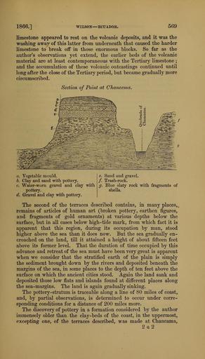 | Keywords: The Quarterly journal of the Geological Society of London (13935673521).jpg 1866 <br> WILSON ECUADOR <br> 569 <br> limestone appeared to rest on the volcanic deposits and it was the <br> washing away of this latter from underneath that caused the harder <br> limestone to break off in those enormous blocks So far as the <br> author's observations yet extend the earlier beds of the volcanic <br> material are at least contemporaneous with the Tertiary limestone ; <br> and the accumulation of these volcanic outcastings continued until <br> long after the close of the Tertiary period but became gradually more <br> circumscribed <br> Section of Point at Chancama <br> a Vegetable mould <br> b Clay and sand with pottery <br> c Water-worn gravel and clay with <br> pottery <br> d Gravel and clay with pottery <br> e Sand and gravel <br> / Trash-rock <br> ff Blue slaty rock with fragments of <br> shells <br> The second of the terraces described contains in many places <br> remains of articles of human art broken pottery earthen figures <br> and fragments of gold ornaments at various depths below the <br> surface but in all cases below high-tide mark from which fact it is <br> apparent that this region during its occupation by man stood <br> higher above the sea than it does now But the sea gradually en- <br> croached on the land till it attained a height of about fifteen feet <br> above its former level That the duration of time occupied by this <br> advance and retreat of the sea must have been very great is apparent <br> when we consider that the stratified earth of the plain is simply <br> the sediment brought down by the rivers and deposited beneath the <br> margins of the sea in some places to the depth of ten feet above the <br> surface on which the ancient cities stood Again the land sank and <br> deposited those low flats and islands found at different places along <br> the sea-margins The land is again gradually sinking <br> The pottery-stratum is traceable along a line of 80 miles of coast <br> and by partial observations is determined to occur under corre- <br> sponding conditions for a distance of 200 miles more <br> The discovery of pottery in a formation considered by the author <br> immensely older than the clay-beds of the coast in the uppermost <br> excepting one of the terraces described was made at Chancama <br> 2q2 36165022 111477 51125 Page 569 Text v 22 http //www biodiversitylibrary org/page/36165022 1866 Geological Society of London Biodiversity Heritage Library The Quarterly journal of the Geological Society of London v 22 1866 Geology Periodicals Smithsonian Libraries bhl page 36165022 dc identifier http //biodiversitylibrary org/page/36165022 smithsonian libraries Information field Flickr posted date ISOdate 2014-04-21 Check categories 2015 August 26 CC-BY-2 0 BioDivLibrary https //flickr com/photos/61021753 N02/13935673521 2015-08-26 06 54 56 cc-by-2 0 PD-old-70-1923 The Quarterly journal of the Geological Society of London 1866 Photos uploaded from Flickr by FĂŚ using a script |