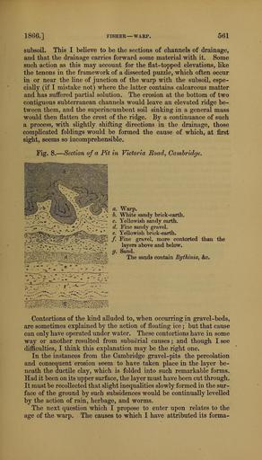 | Keywords: The Quarterly journal of the Geological Society of London (13958812853).jpg 1866 <br> FISHER WARP <br> 561 <br> subsoil This I believe to be the sections of channels of drainage <br> and that the drainage carries forward some material with it Some <br> such action as this may account for the flat-topped elevations like <br> the tenons in the framework of a dissected puzzle which often occur <br> in or near the line of junction of the warp with the subsoil espe- <br> cially if I mistake not where the latter contains calcareous matter <br> and has suffered partial solution The erosion at the bottom of two <br> contiguous subterranean channels would leave an elevated ridge be- <br> tween them and the superincumbent soil sinking in a general mass <br> would then flatten the crest of the ridge By a continuance of such <br> a process with slightly shifting directions in the drainage those <br> complicated foldings would be formed the cause of which at first <br> sight seems so incomprehensible <br> Fig 8 Section of a Pit in Victoria Road Cambridge <br> e '° <br> a Warp <br> b White sandy brick-earth <br> c Yellowish sandy earth <br> d Fine sandy gravel <br> e Yellowish brick-earth <br> / Fine gravel more contorted than the <br> layers above and below <br> g Sand <br> The sands contain Bythinia c <br> Contortions of the kind alluded to when occurring in gravel-beds <br> are sometimes explained by the action of floating ice ; but that cause <br> can only have operated under water These contortions have in some <br> way or another resulted from subaerial causes ; and though I see <br> difficulties I think this explanation may be the right one <br> In the instances from the Cambridge gravel-pits the percolation <br> and consequent erosion seem to have taken place in the layer be- <br> neath the ductile clay which is folded into such remarkable forms <br> Had it been on its upper surface the layer must have been cut through <br> It must be recollected that slight inequalities slowly formed in the sur- <br> face of the ground by such subsidences would be continually levelled <br> by the action of rain herbage and worms <br> The next question which I propose to enter upon relates to the <br> age of the warp The causes to which I have attributed its forma- 36165014 111477 51125 Page 561 Text v 22 http //www biodiversitylibrary org/page/36165014 1866 Geological Society of London NameFound Bythinia NameConfirmed Bythinia EOLID 4814421 NameBankID 4097537 NameFound Victoria NameConfirmed Victoria EOLID 34123 NameBankID 897688 Biodiversity Heritage Library The Quarterly journal of the Geological Society of London v 22 1866 Geology Periodicals Smithsonian Libraries bhl page 36165014 dc identifier http //biodiversitylibrary org/page/36165014 smithsonian libraries Information field Flickr posted date ISOdate 2014-04-21 Check categories 2015 August 26 CC-BY-2 0 BioDivLibrary https //flickr com/photos/61021753 N02/13958812853 2015-08-26 06 54 33 cc-by-2 0 PD-old-70-1923 The Quarterly journal of the Geological Society of London 1866 Photos uploaded from Flickr by FÌ using a script |