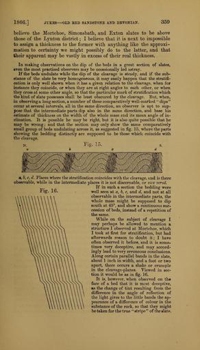 Keywords: The Quarterly journal of the Geological Society of London (13958690233).jpg 1866 <br> JVKES OLD BED SANDSTONE AND DEVONIAN <br> 359 <br> believe the Mortehoe Simonsbath and Exton slates to be above <br> those of the Lynton district ; I believe that it is next to impossible <br> to assign a thickness to the former with anything like the approxi- <br> mation to certainty we might possibly do to the latter and that <br> their apparent may be vastly in excess of their real thickness <br> In making observations on the dip of the beds in a great section of slates <br> even the most practised observers may be occasionally led astray <br> If the beds undulate vrhile the dip of the cleavage is steady and if the sub- <br> stance of the slate be very homogeneous it may easily happen that the stratifi- <br> cation is only vrell shown when it has a given relation to the cleavage when for <br> instance they coincide or when they are at right angles to each other or when <br> they cross at some other angle so that the particular mark of stratification which <br> the kind of slate possesses shall be least obscured by the cleavage But when <br> in observing a long section a number of these comparatively well-marked dips <br> occur at several intervals all in the same direction an observer is apt to sup- <br> pose that the intermediate parts dip also in the same direction and base his <br> estimate of thickness on the width of the whole mass and its mean angle of in- <br> clination It is possible he may be right but it is also quite possible that he <br> may be wrong ; and that the section may only show the same comparatively <br> small group of beds undulating across it as suggested in fig 15 where the parts <br> showing the bedding distinctly are supposed to be those which coincide with <br> the cleavage <br> N rift- s <br> Fig 16 <br> a b c d Places where the stratification coincides with the cleavage and is there <br> observable while in the intermediate places it is not discernable or vice versa <br> If in such a section the bedding were <br> well seen at a b c and d and not at all <br> observable in the intermediate parts the <br> whole mass might be supposed to dip <br> south at 45° and show a continuous suc- <br> cession of beds instead of a repetition of <br> the same <br> While on the subject of cleavage I <br> may perhaps be allowed to mention a <br> structure I observed at Mortehoe which <br> I took at first for stratification but had <br> afterwards reason to doubt it; I have <br> often observed it before and it is some- <br> times very deceptive and may accord- <br> ingly lead to very erroneous conclusions <br> Along certain parallel bands in the slate <br> about 1 inch in width and a foot or two <br> apart there occurs a shake or crumple <br> in the cleavage-planes Viewed in sec- <br> tion it would be as in fig 16 <br> It is however when observed on the <br> face of a bed that it is most deceptive <br> as the change of tint resulting from the <br> difference in the angle of reflection of <br> the light gives to the little bands the ap- <br> pearance of a difference of colour in the <br> substance of the rock so that they might <br> be taken for the true stripe of the slate 36164800 111477 51125 Page 359 Text v 22 http //www biodiversitylibrary org/page/36164800 1866 Geological Society of London NameFound Nucula rift NameConfirmed Nucula EOLID 10719654 NameBankID 2691879 Biodiversity Heritage Library The Quarterly journal of the Geological Society of London v 22 1866 Geology Periodicals Smithsonian Libraries bhl page 36164800 dc identifier http //biodiversitylibrary org/page/36164800 smithsonian libraries Information field Flickr posted date ISOdate 2014-04-21 Check categories 2015 August 26 CC-BY-2 0 BioDivLibrary https //flickr com/photos/61021753 N02/13958690233 2015-08-26 06 54 51 cc-by-2 0 PD-old-70-1923 The Quarterly journal of the Geological Society of London 1866 Photos uploaded from Flickr by Fæ using a script |