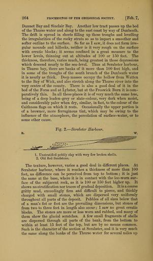 | Keywords: The Quarterly journal of the Geological Society of London (13935362412).jpg 264 PEOCBEDINGS OP THB GEOLOGICAL SOCIETY Feb 7 <br> Dunnet Bay and Sinclair Bay Another low tract passes up the bed <br> of the Thurso water and along to the east coast by way of Dunbeath <br> The drift is spread in sheets filling up these troughs and levelling <br> the irregularities of the rocky strata so as to impart a smoother and <br> softer outline to the surface So far as I saw it does not form irre- <br> gular mounds and hillocks neither is it very rough on the surface <br> with erratic blocks ; it seems confined in a great measure to the <br> lower levels thinning out at altitudes of 100 or 150 feet The <br> thickness therefore varies much being greatest in those depressions <br> which descend nearly to the sea-level Thus at Scrabster harbour <br> in Thurso bay there are banks of it more than 100 feet high and <br> in some of the troughs of the south branch of the Dunbeath water <br> it is nearly as thick Deep masses occupy the hollow from Watten <br> to the Bay of Wick and also stretch along the Thurso river into the <br> very centre of the county There is also a good deal of it in the <br> bed of the Forss and at Lybster but at the Ereswick Burn it is com- <br> paratively thin In all these places it is of very much the same hue <br> being of a deep leaden-grey or slate-colour very dark when moist <br> and considerably paler when dry similar in fact to the colour of the <br> Caithness flags on which it rests Occasionally the upper portion is <br> of a browner more ferruginous tint which may be owing to the <br> influence of the atmosphere the percolation of surface-water or to <br> some other cause <br> Fig 2 ” Scrabster Harhour <br> 1 Unstratified pebbly clay with Tery few broken shells <br> 2 Old Red Sandstone <br> The texture however varies a good deal in different places At <br> Scrabster harbour where it reaches a thickness of more than 100 <br> feet no difference can be perceived from top to bottom ; it is just <br> the same at the base where it is in contact with the ice-worn sur- <br> face of the subjacent rock as it is 100 or 150 feet higher up It <br> shows no stratification nor traces of gradual deposition It is a coarse <br> gritty mud exceedingly firm and difficult to pierce and thickly <br> charged with smaU stones which are dispersed very uniformly <br> throughout all parts of the deposit Pebbles of all sizes below that <br> of a man's fist or foot are the prevaiUng dimensions but stones of <br> from two to three feet in length also occur ; I saw no great erratic <br> blocks The stones are more or less worn and rubbed and many of <br> them show the glacial scratches A few small fragments of shells <br> are dispersed through all parts of the bank from the bottom to <br> within at least 15 feet of the top but are by no means common <br> Such is the character of the section at Scrabster and it is very much <br> the same along the banks of the Thurso water for several miles up 36164693 111477 51125 Page 264 Text v 22 http //www biodiversitylibrary org/page/36164693 1866 Geological Society of London Biodiversity Heritage Library The Quarterly journal of the Geological Society of London v 22 1866 Geology Periodicals Smithsonian Libraries bhl page 36164693 dc identifier http //biodiversitylibrary org/page/36164693 smithsonian libraries Information field Flickr posted date ISOdate 2014-04-21 Check categories 2015 August 26 CC-BY-2 0 BioDivLibrary https //flickr com/photos/61021753 N02/13935362412 2015-08-26 06 55 38 cc-by-2 0 PD-old-70-1923 The Quarterly journal of the Geological Society of London 1866 Photos uploaded from Flickr by Fæ using a script |