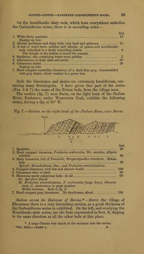 | Keywords: The Quarterly journal of the Geological Society of London (13935212392).jpg GOD WIN- AUSTEN KASHMEKE CARBONIFEROUS ROCKS 33 <br> On the hornblendic slaty rock which here everywhere imderlies <br> the Carboniferous series there is in ascending order ” <br> feet <br> 1 White flinty quartzite 12 <br> Passing up into <br> 2 Altered sandstone and shaly beds very hard and spHntery 15 <br> 3 A bed of water-worn pebbles and shingle of quartz and hornblendic <br> rock imbedded in a sandy crumbling matrix 4 <br> The shingle at the bottom is much the coarsest <br> 4 Sandstone also containing water-worn pebbles 2 <br> 5 Alternations of shaly slate and sands 30 <br> 6 Calcareous shales 20 <br> Passing up into <br> 7 Hard compact crystalline limestone of a dark -blue grey interstratified <br> with grey shales which weather to a green tint <br> Both the limestones and shales are extremely fossiliferous con- <br> taining many Brachiopoda I have given this part of the series <br> Nos 6 7 the name of the Zewan beds from the village near <br> The section fig 7 near Barns on the right bank of the Jhelnm <br> Eiver Kashmcre under Wasterwan Peak exhibits the following <br> strata having a dip of 50° W <br> Pig 7 ” Section on the right hank of the Jheliim River near Barus <br> Eoad <br> f W <br> 1 b a 5 432 1 <br> 6 <br> feet <br> 1 Quartzite 20 <br> 2 Hard compact limestone Productus scabriculus Ter sacculus Athyris <br> suhtilita 40 <br> 3 Shaly limestone full of Fenestella Streptorhynchus crenistria Zewan <br> beds 50 <br> Spirifer Moosakailensis Dav and Productus semireticulatus <br> 4 Compact limestone with few and obscure fossils 100 <br> 5 Calcareous slate or shale 30 <br> 6 Micaceous sandy calcareous beds ” in all 60 <br> 6a Sjpirifera Bajah <br> 66 Productus semireticulatus P scabriculus large form Chonetes <br> Icsvis C Austeniana in great number <br> 30 feet between Beds 5 fig 3 <br> 7 Hard compact grey limestones No fossils seen about 150 <br> Section across the Entrance of Ravine ” Above the village of <br> Khoonmoo there is a very interesting section as a great thickness of <br> the Carboniferous series is exhibited On the left and overlying the <br> Hornblende-slate series are the beds represented in Sect B dipping <br> in the same direction as all the other beds at this place <br> A large Chunar tree stands at the entrance into the ravine <br> VOL XXII PART I B 36164430 111477 51125 Page 33 Text v 22 http //www biodiversitylibrary org/page/36164430 1866 Geological Society of London NameFound Athyris NameConfirmed Athyris NameBankID 4083195 NameFound Austeniana NameFound Brachiopoda NameConfirmed Brachiopoda EOLID 1498 NameBankID 230460 NameFound Chonetes NameConfirmed Chonetes NameBankID 4115024 NameFound Fenestella NameConfirmed Fenestella EOLID 13185859 NameBankID 234914 NameFound Moosakailensis NameFound Productus scabriculus NameConfirmed Productus scabriculus NameFound Productus semireticulatus NameConfirmed Productus semireticulatus NameBankID 5727959 NameFound Spirifer NameConfirmed Spirifer NameBankID 4349330 NameFound Streptorhynchus crenistria NameConfirmed Streptorhynchus crenistria Biodiversity Heritage Library The Quarterly journal of the Geological Society of London v 22 1866 Geology Periodicals Smithsonian Libraries bhl page 36164430 dc identifier http //biodiversitylibrary org/page/36164430 smithsonian libraries Information field Flickr posted date ISOdate 2014-04-21 Check categories 2015 August 26 CC-BY-2 0 BioDivLibrary https //flickr com/photos/61021753 N02/13935212392 2015-08-26 06 56 22 cc-by-2 0 PD-old-70-1923 The Quarterly journal of the Geological Society of London 1866 Photos uploaded from Flickr by Fæ using a script |