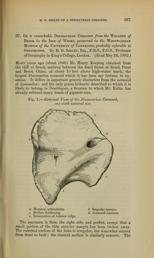 Keywords: The Quarterly journal of the Geological Society of London (13860280644).jpg H G SEELEY ON A DINOSAURIAN CORACOID <br> 36 <br> 37 On a remarkable Dinosaurian Coracoid from the Wealden of <br> Brook in the Isle of Wight preserved in the Woodwardian <br> Museum of the University of Cambridge probably referable to <br> Ornithopsis By H G Seeley Esq F B S F G S Professor <br> of Geography in King's College London Kead May 24 1882 <br> Many years ago about 1866 Mr Henry Keeping obtained from <br> the cliff at Brook midway between the fossil forest at Brook Point <br> and Brook Chine at about 10 feet above high-water mark the <br> largest Dinosaurian coracoid which it has been my fortune to ex- <br> amine It differs in important generic characters from the coracoid <br> of Iguanodon ; and the only genus hitherto described to which it is <br> likely to belong is Ornithopsis a Saurian to which Mr Hulke has <br> already referred many bones of gigantic size <br> Fig 1 ” External View of the Dinosaurian Coracoid <br> one sixth natural size <br> a Humeral articulation <br> c Median thickening <br> e Termination of inferior ridge <br> b Scapular margin <br> d Coracoid foramen <br> The specimen is from the right side and perfect except that a <br> small portion of the thin anterior margin has been broken away <br> The external surface of the bone is irregular but somewhat convex <br> from front to back ; the visceral surface is similarly concave The 36936168 113692 51125 Page 367 Text 38 http //www biodiversitylibrary org/page/36936168 1882 Geological Society of London NameFound Iguanodon NameConfirmed Iguanodon EOLID 4530741 NameBankID 4204832 NameFound Ornithopsis NameConfirmed Ornithopsis NameBankID 4270321 Biodiversity Heritage Library The Quarterly journal of the Geological Society of London v 38 1882 Geology Periodicals Smithsonian Libraries bhl page 36936168 dc identifier http //biodiversitylibrary org/page/36936168 smithsonian libraries Information field Flickr posted date ISOdate 2014-04-15 Check categories 2015 August 26 CC-BY-2 0 BioDivLibrary https //flickr com/photos/61021753 N02/13860280644 2015-08-26 07 53 44 cc-by-2 0 PD-old-70-1923 The Quarterly journal of the Geological Society of London 1882 Photos uploaded from Flickr by Fæ using a script |