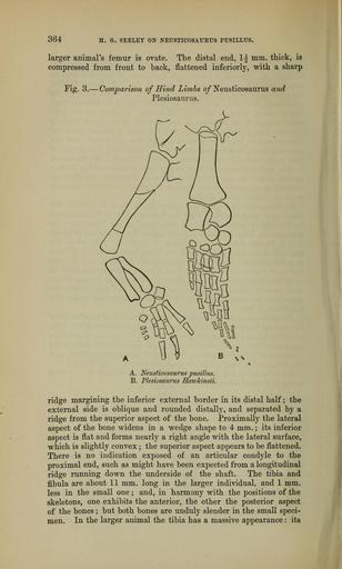 | Keywords: The Quarterly journal of the Geological Society of London (13860274604).jpg 364 <br> H G SEELET ON NEUSTICOSAURTJS PTJSILLTJS <br> larger animal's femur is ovate The distal end 1 mm thick is <br> compressed from front to back flattened inferiorly with a sharp <br> Fig 3 ” Comparison of Hind Limbs of Neusticosaurus and <br> Plesiosanrus <br> A Neusticosaurus pusillus <br> B Plesiosanrus Hawkinsii <br> ridge margining the inferior external border in its distal half ; the <br> external side is oblique and rounded distally and separated by a <br> ridge from the superior aspect of the bone Proximally the lateral <br> aspect of the bone widens in a wedge shape to 4 mm ; its inferior <br> aspect is flat and forms nearly a right angle with the lateral surface <br> which is slightly convex ; the superior aspect appears to be flattened <br> There is no indication exposed of an articular condyle to the <br> proximal end such as might have been expected from a longitudinal <br> ridge running down the underside of the shaft The tibia and <br> fibula are about 11 mm long in the larger individual and 1 mm <br> less in the small one ; and in harmony with the positions of the <br> skeletons one exhibits the anterior the other the posterior aspect <br> of the bones ; but both bones are unduly slender in the small speci- <br> men In the larger animal the tibia has a massive appearance its 36936161 113692 51125 Page 364 Text 38 http //www biodiversitylibrary org/page/36936161 1882 Geological Society of London NameFound Neusticosaurus NameConfirmed Neusticosaurus EOLID 4532500 NameBankID 4258287 NameFound Neusticosaurus pusillus NameConfirmed Neusticosaurus pusillus Fraas 1881 EOLID 13614304 Biodiversity Heritage Library The Quarterly journal of the Geological Society of London v 38 1882 Geology Periodicals Smithsonian Libraries bhl page 36936161 dc identifier http //biodiversitylibrary org/page/36936161 smithsonian libraries Information field Flickr posted date ISOdate 2014-04-15 Check categories 2015 August 26 CC-BY-2 0 BioDivLibrary https //flickr com/photos/61021753 N02/13860274604 2015-08-26 07 53 45 cc-by-2 0 PD-old-70-1923 The Quarterly journal of the Geological Society of London 1882 Photos uploaded from Flickr by Fæ using a script |
