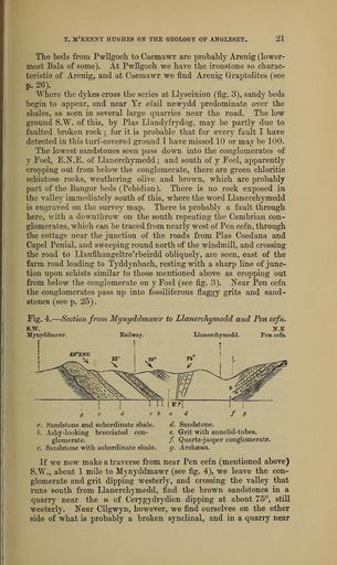 | Keywords: The Quarterly journal of the Geological Society of London (13859687323).jpg T M'KENNY HUGHES OST THE GEOLOGY OE ANGLESEY <br> 21 <br> The beds from Pwllgoch to Caemawr are probably Arenig lower- <br> most Bala of some At Pwllgoch we have the ironstone so charac- <br> teristic of Arenig and at Caemawr we find Arenig Graptolites see <br> p 26 <br> Where the dykes cross the series at Llyseinion fig 3 sandy beds <br> begin to appear and near Yr efail newydd predominate over the <br> shales as seen in several large quarries near the road The low <br> ground S W of this by Plas Llandyfrydog may be partly due to <br> faulted broken rock ; for it is probable that for every fault I have <br> detected in this turf-covered ground I have missed 10 or may be 100 <br> The lowest sandstones seen pass down into the conglomerates of <br> y Eoel E N E of Llanerchymedd ; and south of y Eoel apparently <br> cropping out from below the conglomerate there are green chloritic <br> schistose rocks weathering olive and brown which are probably <br> part of the Bangor beds Pebidian There is no rock exposed in <br> the valley immediately south of this where the word Llanerchymedd <br> is engraved on the survey map There is probably a fault through <br> here with a downthrow on the south repeating the Cambrian con- <br> glomerates which can be traced from nearly west of Pen cefn through <br> the cottage near the junction of the roads from Plas Coedana and <br> Capel Penial and sweeping round north of the windmill and crossing <br> the road to Llanfihangeltre'rbeirdd obliquely are seen east of the <br> farm road leading to Tyddynbach resting with a sharp line of junc- <br> tion upon schists similar to those mentioned above as cropping out <br> from below the conglomerate on y Eoel see fig 3 Near Pen cefn <br> the conglomerates pass up into fossiliferous flaggy grits and sand- <br> stones see p 25 <br> Pig 4 ” Section from Mynyddmawr to Llanerchymedd and Pen cefn <br> Llanerchymedd <br> N E <br> Pen cefn <br> a Sandstone and subordinate shale <br> b Ashy -looking brecciated con- <br> glomerate <br> c Sandstone with subordinate shale <br> d Sandstone <br> e Grit with annelid-tubes <br> / Quartz-jasper conglomerate <br> g Archaean <br> If we now make a traverse from near Pen cefn mentioned above <br> S W about 1 mile to Mynyddmawr see fig 4 we leave the con- <br> glomerate and grit dipping westerly and crossing the valley that <br> runs south from Llanerchymedd find the brown sandstones in a <br> quarry near the n of Cerygydrydion dipping at about 75° still <br> westerly Near Cilgwyn however we find ourselves on the other <br> side of what is probably a broken synclinal and in a quarry near 36935746 113692 51125 Page 21 Text 38 http //www biodiversitylibrary org/page/36935746 1882 Geological Society of London NameFound Graptolites NameConfirmed Graptolites NameBankID 423327 Biodiversity Heritage Library The Quarterly journal of the Geological Society of London v 38 1882 Geology Periodicals Smithsonian Libraries bhl page 36935746 dc identifier http //biodiversitylibrary org/page/36935746 smithsonian libraries Information field Flickr posted date ISOdate 2014-04-15 Check categories 2015 August 26 CC-BY-2 0 BioDivLibrary https //flickr com/photos/61021753 N02/13859687323 2015-08-26 07 51 29 cc-by-2 0 PD-old-70-1923 The Quarterly journal of the Geological Society of London 1882 Photos uploaded from Flickr by Fæ using a script |