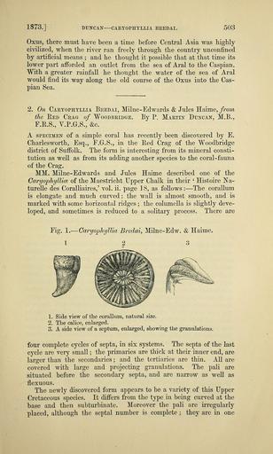 | Keywords: The Quarterly journal of the Geological Society of London (13369196113).jpg 1873 <br> DUNCAN CARYOPHYLLIA BREDAI <br> 503 <br> Oxus there must have been a time before Central Asia was highly <br> civilized when the river ran freely through the country unconfined <br> by artificial means ; and he thought it possible that at that time its <br> lower part afforded an outlet from the sea of Aral to the Caspian <br> With a greater rainfall he thought the water of the sea of Aral <br> would find its way along the old course of the Oxus into the Cas- <br> pian Sea <br> 2 On Caryophyllia Bredai Milne-Edwards Jules Haime from <br> the Red Crag of Woodbridge By P Martin Duncan M B <br> F R S V P G S c <br> A specimen of a simple coral has recently been discovered by E <br> Charlesworth Esq F G S in the Red Crag of the Woodbridge <br> district of Suffolk The form is interesting from its mineral consti- <br> tution as well as from its adding another species to the coral-fauna <br> of the Crag <br> MM Milne-Edwards and Jules Haime described one of the <br> Caryophyllia of the Maestricht Upper Chalk in their ' Histoire Na- <br> turelle des Coralliaires ' vol ii page 18 as follows ” The corallum <br> is elongate and much curved ; the wall is almost smooth and is <br> marked with some horizontal ridges ; the columella is slightly deve- <br> loped and sometimes is reduced to a solitary process There are <br> Fig 1 ” Caryophyllia Bredai Milne-Edw Haime <br> 1 2 3 <br> 1 Side view of the corallum natural size <br> 2 The calice enlarged <br> 3 A side view of a septum enlarged showing the granulations <br> four complete cycles of septa in six systems The septa of the last <br> cycle are very small ; the primaries are thick at their inner end are <br> larger than the secondaries ; and the tertiarics are thin All are <br> covered with large and projecting granulations The pali are <br> situated before the secondary septa and are narrow as well as <br> flexuous <br> The newly discovered form appears to be a variety of this Upper <br> Cretaceous species It differs from the type in being curved at the <br> base and then subturbinatc Moreover the pali are irregularly <br> placed although the septal number is complete ; they are in one 39051441 120601 51125 Page 503 Text v 29 http //www biodiversitylibrary org/page/39051441 1873 Geological Society of London NameFound Caryophyllia NameConfirmed Caryophyllia EOLID 11129596 NameBankID 2566615 NameFound Caryophyllia bredai NameConfirmed Caryophyllia bredai Biodiversity Heritage Library The Quarterly journal of the Geological Society of London v 29 1873 Geology Periodicals Smithsonian Libraries bhl page 39051441 dc identifier http //biodiversitylibrary org/page/39051441 smithsonian libraries Information field Flickr posted date ISOdate 2014-03-24 Check categories 2015 August 26 CC-BY-2 0 BioDivLibrary https //flickr com/photos/61021753 N02/13369196113 2015-08-26 10 51 47 cc-by-2 0 PD-old-70-1923 The Quarterly journal of the Geological Society of London 1873 Photos uploaded from Flickr by Fæ using a script |