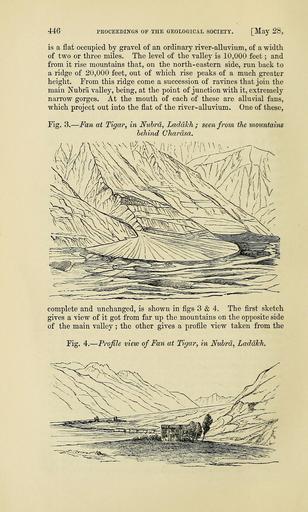 | Keywords: The Quarterly journal of the Geological Society of London (13369379074).jpg 446 <br> PROCEEDINGS OF THE GEOLOGICAL SOCIETY May 28 <br> is a flat occupied by gravel of an ordinary river-alluvium of a width <br> of two or three miles The level of the valley is 10 000 feet ; and <br> from it rise mountains that on the north-eastern side run back to <br> a ridge of 20 000 feet out of which rise peaks of a much greater <br> height From this ridge come a succession of ravines that join the <br> main Nubra valley being at the point of junction with it extremely <br> narrow gorges At the mouth of each of these are alluvial fans <br> which project out into the flat of the river- alluvium One of these <br> Fig 3 ” Fan at Tigar in Nubrd Laddlch; seen from the mountains <br> behind Chardsa <br> complete and unchanged is shown in figs 3 4 The first sketch <br> gives a view of it got from far up the mountains on the opposite side <br> of the main valley ; the other gives a profile view taken from the <br> Fig 4 ” Profile view of Fan at Tigar in Niihrd Laddlch 39051384 120601 51125 Page 446 Text v 29 http //www biodiversitylibrary org/page/39051384 1873 Geological Society of London Biodiversity Heritage Library The Quarterly journal of the Geological Society of London v 29 1873 Geology Periodicals Smithsonian Libraries bhl page 39051384 dc identifier http //biodiversitylibrary org/page/39051384 smithsonian libraries Information field Flickr posted date ISOdate 2014-03-24 Check categories 2015 August 26 CC-BY-2 0 BioDivLibrary https //flickr com/photos/61021753 N02/13369379074 2015-08-26 10 51 20 cc-by-2 0 PD-old-70-1923 The Quarterly journal of the Geological Society of London 1873 Photos uploaded from Flickr by Fæ using a script |