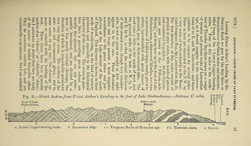 | Keywords: The Quarterly journal of the Geological Society of London (13369063194).jpg 1872 <br> NICHOLSON NORTH SHORE OF LAKE SUPERIOR <br> 21 <br> Leaving Prince Arthur's Landing by the <br> Dawson Road we pass for the first three or <br> four miles over the black shales and interstra- <br> tified traps of the Lower Copper-bearing <br> series Four or five miles to the north- <br> east of Thunder Bay there comes on a range <br> of syenitic and gneissic rocks of Laurentian <br> age as I should imagine by the interven- <br> tions of an E and W dislocation ; and these <br> continue to be exposed for several miles <br> These in turn are succeeded to the N W by <br> a vast series of rocks referable to the Huro- <br> nian Group see Map fig 1 and section fig 2 <br> The first members of this series consist of <br> greenish or grey slates with bands of gneiss <br> and occasional trap-dykes At the Govern <br> ment post known as the Fifteen-mile <br> Shanty and from here up to the foot of Lake <br> Shabendowan a distance of 32 miles we cross <br> a succession of bedded traps mostly green in <br> colour interstratified with great masses of <br> greenish grey or drab-coloured slate The <br> road runs a little to the north of west and <br> the general strike of the beds is W by IS <br> and E by S ; so that the actual thickness <br> of beds crossed over though very consider- <br> able is not so great as might at first sight <br> appear to be the case These Huronian <br> slates and traps present a most singular <br> resemblance to the green slates and por- <br> phyries of the Lake -district of the north <br> of England This likeness is shown in their <br> mode of weathering in the kind of scenery <br> produced and especially in the lithological <br> character of the slates The slates in ques- <br> tion have a prevailing green colour are <br> usually fine-grained but are not unfre- <br> quently brecciated and are divided by a <br> more or less nearly vertical cleavage the <br> direction of which is remarkably persistent <br> over very large areas The surfaces of the <br> slate are not uncommonly glossy ; and in <br> some cases at any rate tbe cleavage ap- <br> pears to coincide with the bedding of the <br> rock These slates have been generally <br> spoken of as talcose or chloritic slates ; <br> but I entertain no doubt that they are truly <br> of the nature of bedded felspathic ashes <br> They do sometimes contain talc and are <br> occasionally serpentinous ; but I am satisfied <br> q <br> oq <br> <br> K <br> SQ <br> OQ <br> W <br> w <br> K <br> hJ <br> Q <br> MtfAY 39050895 120601 51125 Page 21 Text v 29 http //www biodiversitylibrary org/page/39050895 1873 Geological Society of London NameFound Huro NameConfirmed Huro EOLID 4602022 NameBankID 177214 Biodiversity Heritage Library The Quarterly journal of the Geological Society of London v 29 1873 Geology Periodicals Smithsonian Libraries bhl page 39050895 dc identifier http //biodiversitylibrary org/page/39050895 smithsonian libraries Information field Flickr posted date ISOdate 2014-03-24 Check categories 2015 August 26 CC-BY-2 0 BioDivLibrary https //flickr com/photos/61021753 N02/13369063194 2015-08-26 10 51 06 cc-by-2 0 PD-old-70-1923 The Quarterly journal of the Geological Society of London 1873 Photos uploaded from Flickr by Fæ using a script |