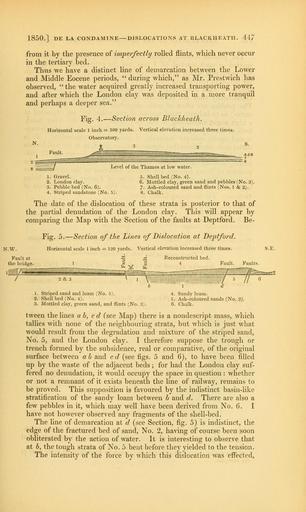 Keywords: The Quarterly journal of the Geological Society of London (13365623973).jpg 1850 DE LA CONDAMINE ” DISLOCATIONS AT ELACKHEATH 44/ <br> from it by the presence of imiierfectly rolled flints which never occur <br> in the tertiary bed <br> Thus we have a distinct line of demarcation between the Lower <br> and Middle Eocene periods during which as Mr Prestwich has <br> observed the water acquired greatly increased transporting power <br> and after which the London clay was deposited in a more tranquil <br> and perhaps a deeper sea <br> Fig 4 ” Section across Blackheath <br> Horizontal scale 1 inch 500 yards Vertical elevation increased three times <br> Observatory <br> 8 Si \4S«W»WW <br> 1 Gravel <br> 2 London clay <br> 3 Pebble bed No 6 <br> 4 Striped sandstone No 5 <br> 5 Shell bed No 4 <br> 6 Mottled clay green sand and pebbles No 3 <br> 7 Ash-coloured sand and flints Nos 1 2 <br> 8 Chalk <br> N W <br> The date of the dislocation of these strata is posterior to that of <br> the partial denudation of the London clay This will appear by <br> comparing the Map with the Section of the faults at Deptford Be- <br> Fig 5 ” Section of the Lines of Dislocation at Deptford <br> Horizontal scale 1 inch 120 yards Vertical elevation increased three times S E <br> ii Reconstructed bed <br> g 4 Fault Faults <br> 1 Striped sand and loam No 5 <br> 2 SheUbed No 4 <br> 3 Mottled clay green sand and flints No 3 <br> 4 Sandy loam <br> 5 Ash-coloured sands No 2 <br> 6 Chalk <br> tween the lines ah cd Csee Map there is a nondescript mass which <br> tallies with none of the neighbouring strata but which is just what <br> would result from the degradation and mixture of the striped sand <br> No 5 and the London clay I therefore suppose the trough or <br> trench formed by the subsidence real or comparative of the original <br> surface between a h and c d see figs 5 and 6 to have been filled <br> up by the waste of the adjacent beds ; for had the London clay suf- <br> fered no denudation it would occupy the space in question whether <br> or not a remnant of it exists beneath the line of railway remains to <br> be proved This supposition is favoured by the indistinct basin-like <br> stratification of the sandy loam between h and d There are also a <br> few pebbles in it which may well have been derived from No 6 I <br> have not however observed any fragments of the shell-bed <br> The line of demarcation at d see Section fig 5 is indistinct the <br> edge of the fractured bed of sand No 2 having of course been soon <br> obliterated by the action of water It is interesting to observe that <br> at 6 the tough strata of No 5 bent before they yielded to the tension <br> The intensity of the force by which this dislocation was effected 36934318 113689 51125 Page 447 Text v 6 http //www biodiversitylibrary org/page/36934318 1850 Geological Society of London Biodiversity Heritage Library The Quarterly journal of the Geological Society of London v 6 1850 Geology Periodicals Smithsonian Libraries bhl page 36934318 dc identifier http //biodiversitylibrary org/page/36934318 smithsonian libraries Information field Flickr posted date ISOdate 2014-03-23 Check categories 2015 August 26 CC-BY-2 0 BioDivLibrary https //flickr com/photos/61021753 N02/13365623973 2015-08-26 10 51 54 cc-by-2 0 PD-old-70-1923 The Quarterly journal of the Geological Society of London 1850 Photos uploaded from Flickr by Fæ using a script |