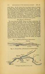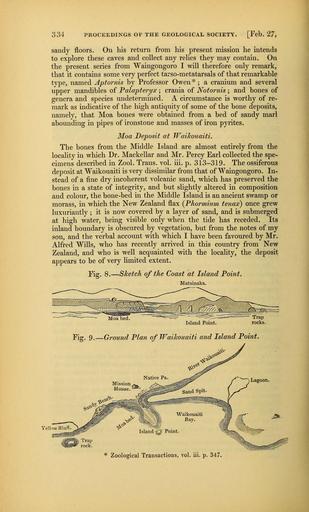 Keywords: The Quarterly journal of the Geological Society of London (13365496183).jpg 334 PROCEEDINGS OF THE GEOLOGICAL SOCIETY Feb 27 <br> sandy floors On his return from his present mission he intends <br> to explore these caves and collect any relics they may contain On <br> the present series from Waingongoro I will therefore only remark <br> that it contains some very perfect tarso-metatarsals of that remarkable <br> type named Aptornis by Professor Owen ; a cranimn and several <br> upper mandibles of Falapteryx ; crania of Notornis ; and bones of <br> genera and species undetermined A circumstance is worthy of re- <br> mark as indicative of the high antiquity of some of the bone deposits <br> namely that Moa bones were obtained from a bed of sandy marl <br> abounding in pipes of ironstone and masses of iron pyrites <br> Moa Deposit at Waikouaiti <br> The bones from the Middle Island are almost entirely from the <br> locality in which Dr Mackellar and Mr Percy Earl collected the spe- <br> cimens described in Zool Trans vol iii p 313-319 The ossiferous <br> deposit at Waikouaiti is very dissimilar from that of Waingongoro In- <br> stead of a fine dry incoherent volcanic sand which has preserved the <br> bones in a state of integrity and but slightly altered in composition <br> and colour the bone-bed in the Middle Island is an ancient swamp or <br> morass in which the New Zealand flax Phormium tenax once grew <br> luxuriantly ; it is now covered by a layer of sand and is submerged <br> at high water being visible only when the tide has receded Its <br> inland boundary is obscured by vegetation but from the notes of my <br> son and the verbal account with which I have been favoured by Mr <br> Alfred Wills who has recently arrived in this country from New <br> Zealand and who is well acquainted with the locality the deposit <br> appears to be of very Umited extent <br> Fig 8 ” Sketch of the Coast at Island Point <br> Matainaka <br> Island Point <br> Fig 9 ” Ground Plan of Waikouaiti and Island Point <br> Native Pa <br> Mission <br> House <br> Yellow Bluff <br> Zoological Transactions vol iii p 347 36934195 113689 51125 Page 334 Text v 6 http //www biodiversitylibrary org/page/36934195 1850 Geological Society of London NameFound Aptornis NameConfirmed Aptornis EOLID 4364578 NameBankID 4076364 NameFound Notornis NameConfirmed Notornis Owen 1848 EOLID 33387 NameFound Phormium tenax NameConfirmed Phormium tenax EOLID 1015114 NameBankID 3876664 Biodiversity Heritage Library The Quarterly journal of the Geological Society of London v 6 1850 Geology Periodicals Smithsonian Libraries bhl page 36934195 dc identifier http //biodiversitylibrary org/page/36934195 smithsonian libraries Information field Flickr posted date ISOdate 2014-03-23 Check categories 2015 August 26 CC-BY-2 0 BioDivLibrary https //flickr com/photos/61021753 N02/13365496183 2015-08-26 10 55 36 cc-by-2 0 PD-old-70-1923 The Quarterly journal of the Geological Society of London 1850 Photos uploaded from Flickr by Fæ using a script |