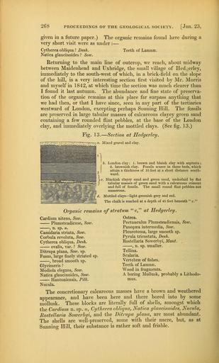 | Keywords: The Quarterly journal of the Geological Society of London (13365422043).jpg 268 <br> PROCEEDINGS OF THE GEOLOGICAL SOCIETY Jail 23 <br> given in a future paper The organic remains found here during a <br> very short visit were as under <br> Cytherea obliqua Desk Teeth of Lamnae <br> Natica glaucinoides Sow <br> Returning to the main hue of outcrop we reach about midway <br> between Maidenhead and Uxbridge the small village of Hed erley <br> immediately to the south-west of which in a brick-field on the slope <br> of the hill is a very interesting section first visited by Mr Morris <br> and myself in 1842 at which time the section was much clearer than <br> I found it last autumn The abundance and fine state of preserva- <br> tion of the organic remains at this place far surpass anything that <br> we had then or that I have since seen in any part of the tertiaries <br> westward of London excepting perhaps Sonning Hill The fossils <br> are preserved in large tabular masses of calcareous clayey green sand <br> containing a few rounded flint pebbles at the base of the London <br> clay and immediately overlying the mottled clays See fig 13 <br> Fig 13 Section at Hedgerley <br> a Mixed gravel and clay <br> b London claj' 1 brown and bluish clay with septaria ; <br> 2 brownish clay Fossils scarce in these beds which <br> attain a thickness of 35 feet at a short distance south- <br> ward <br> Blackish clayey sand and green sand underlaid by flat <br> tabular masses of green sand with a calcareous cement <br> and full of fossils The small round flint pebbles not <br> numerous <br> Mottled clays light greenish grey and red <br> The chalk is reached at a depth of 45 feet beneath c <br> of stratum c at Hedgerley <br> Ostrea <br> Pectunculus Plumsteadiensis Soiv <br> Panopsea intermedia Soiv <br> Pleurotoma large smooth sp <br> Pyrula tricostata Desh <br> Rostellaria Sowerbyi Mant <br> n sp smaller <br> Tellina <br> Scalaria <br> Vertebrae of fishes <br> Teeth of Lamnae <br> Wood in fragments <br> A boring Mollusk probably a Lithodo- <br> Organic remains <br> Cardium nitens Sow <br> Plumsteadiense Sow <br> n sp a <br> Cassidaria striata Sow <br> Corbula revoluta Sow <br> Cytherea obliqua Desh <br> ovalis var Sow <br> Ditrupa plana Sow sp <br> Fusus large finely striated sp <br> broad smooth sp <br> Glycimeris <br> Modiola elegans Sow <br> Natica glaucinoides Sow <br> Hantoniensis Pilk mus <br> Nucula <br> The concretionary calcareous masses have a brown and weathered <br> appearance and have been here and there bored into by some <br> mollusk These blocks are hterally full of shells amongst which <br> the Cardium n sp o Cytherea obliqua Natica glaucinoides Nucula <br> Rostellaria Sowerbyi and the Ditrupa plana are most abundant <br> The shells are well-preserved soine with their nacre but as at <br> Sunning Hill their substance is rather soft and friable 36934123 113689 51125 Page 268 Text v 6 http //www biodiversitylibrary org/page/36934123 1850 Geological Society of London NameFound Cardium NameConfirmed Cardium EOLID 50301 NameBankID 2693257 NameFound Cardium nitens NameConfirmed Canthium nitens DC EOLID 1295347 NameFound Cassidaria striata NameConfirmed Cassidaria striata Lamarck 1816 NameFound Corbula revoluta NameConfirmed Corbula revoluta NameFound Cytherea obliqua NameFound Ditrupa plana NameConfirmed Ditrupa plana NameFound Fusus NameConfirmed Fusus EOLID 2988518 NameBankID 4173880 NameFound Glycimeris NameConfirmed Glycimeris EOLID 4728187 NameBankID 4178508 NameFound Modiola elegans NameConfirmed Modiola elegans NameBankID 6464534 NameFound Natica glaucinoides NameFound Nucula NameConfirmed Nucula EOLID 10719654 NameBankID 2691879 NameFound Ostrea NameConfirmed Ostrea EOLID 10719983 NameBankID 2692450 NameFound Panopsea intermedia NameConfirmed Panopaea intermedia NameFound Pectunculus NameConfirmed Pectunculus EOLID 4728114 NameBankID 4286045 NameFound Pleurotoma NameConfirmed Pleurotoma EOLID 3035199 NameBankID 4302856 NameFound Plumsteadiensis NameFound Pyrula tricostata NameFound Rostellaria NameConfirmed Rostellaria EOLID 4873050 NameBankID 3940657 NameFound Scalaria NameConfirmed Scalaria EOLID 4856646 NameBankID 245500 NameFound Tellina NameConfirmed Tellina EOLID 50297 NameBankID 2693370 Biodiversity Heritage Library The Quarterly journal of the Geological Society of London v 6 1850 Geology Periodicals Smithsonian Libraries bhl page 36934123 dc identifier http //biodiversitylibrary org/page/36934123 smithsonian libraries Information field Flickr posted date ISOdate 2014-03-23 Check categories 2015 August 26 CC-BY-2 0 BioDivLibrary https //flickr com/photos/61021753 N02/13365422043 2015-08-26 12 00 10 cc-by-2 0 PD-old-70-1923 The Quarterly journal of the Geological Society of London 1850 Photos uploaded from Flickr by FĂŚ using a script |