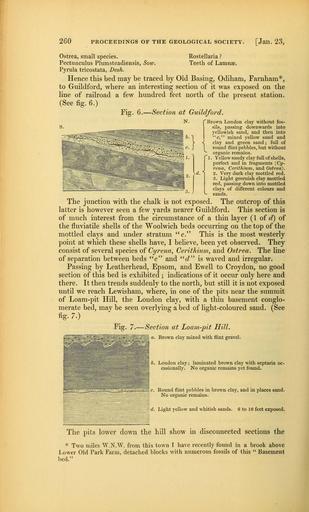 | Keywords: The Quarterly journal of the Geological Society of London (13365247245).jpg 260 <br> PROCEEDINGS OF THE GEOLOGICAL SOCIETY JaU 23 <br> Ostrea small species Rostellaria <br> Pectunculus Plumsteadiensis Sow Teeth of Lamnse <br> Pyrula tricostata Desk <br> Hence this bed may be traced by Old Basing Odiham Farnham <br> to Guildford where an interesting section of it was exposed on the <br> line of railroad a few hundred feet north of the present station <br> See fig 6 <br> Fig 6 ” Section at Guildford <br> fBro rn London clay mthout fos- <br> sils passing downwards into <br> yellowish sand and then into <br> e mixed yellow sand and <br> clay and green sand ; full of <br> round flint pebbles but without <br> organic remains <br> Yellow sandy clay full of shells <br> perfect and in fragments Cy- <br> rena Cerithhim and Ostrea <br> 2 Very dark clay mottled red <br> 3 Light greenish clay mottled <br> red passing down into mottled <br> clays of different colours and <br> sands <br> The junction with the chalk is not exposed The outcrop of this <br> latter is however seen a few yards nearer Guildford This section is <br> of much interest from the circumstance of a thin layer 1 of c of <br> the fluviatile shells of the Woolwich beds occurring on the top of the <br> mottled clays and under stratum c This is the most westerly <br> point at which these shells have I beheve been yet observed They <br> consist of several species of Cyrena Cerit iium and Ostrea The hne <br> of separation between beds 'c and is waved and irregular <br> Passing by Leatherhead Epsom and Ewell to Croydon no good <br> section of this bed is exhibited ; indications of it occur only here and <br> there It then trends suddenly to the north but still it is not exposed <br> until we reach Lewisham where in one of the pits near the summit <br> of Loam-pit Hill the London clay with a thin basement conglo- <br> merate bed may be seen overlying a bed of light-coloured sand See <br> fig 7 <br> Fig 7 ” Section at Loam-pit Hill <br> a Brown clay mixed with flint gravel <br> b London clay; laminated brown clay with septaria oc- <br> casionally No organic remains yet found <br> c Round flint pebbles in brown clay and in places sand <br> No organic remains <br> d Light yellow and whitish sa <br> 8 to 10 feet exposed <br> The pits lower down the hill show in disconnected sections the <br> Two miles W N W from this to Yn T have recently found in a brook above <br> Lower Old Park Farm detached blocks with numerous fossils of this Basement <br> bed 36934115 113689 51125 Page 260 Text v 6 http //www biodiversitylibrary org/page/36934115 1850 Geological Society of London NameFound Cyrena NameConfirmed Cyrena EOLID 4757476 NameBankID 4134596 NameFound Ostrea NameConfirmed Ostrea EOLID 10719983 NameBankID 2692450 NameFound Pectunculus NameConfirmed Pectunculus EOLID 4728114 NameBankID 4286045 NameFound Plumsteadiensis NameFound Pyrula tricostata NameFound Rostellaria NameConfirmed Rostellaria EOLID 4873050 NameBankID 3940657 Biodiversity Heritage Library The Quarterly journal of the Geological Society of London v 6 1850 Geology Periodicals Smithsonian Libraries bhl page 36934115 dc identifier http //biodiversitylibrary org/page/36934115 smithsonian libraries Information field Flickr posted date ISOdate 2014-03-23 Check categories 2015 August 26 CC-BY-2 0 BioDivLibrary https //flickr com/photos/61021753 N02/13365247245 2015-08-26 11 56 08 cc-by-2 0 PD-old-70-1923 The Quarterly journal of the Geological Society of London 1850 Photos uploaded from Flickr by Fæ using a script |