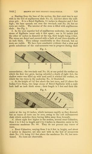 | Keywords: The Quarterly journal of the Geological Society of London (13365010895).jpg 1849 <br> BROWN ON THE SYDNEY COAL-FIELD <br> 129 <br> a Starting from the base of the section the first erect tree is met <br> with in the bed of argillaceous shale No 51 222 feet above the mill- <br> stone grit It is a fluted Sigillaria 15 inches in diameter and 3 feet <br> high ; the base spreads out over the two-inch coal No 50 but no <br> roots are visible The interior of the stem is filled with argillaceous <br> shale See Fig 5 <br> h In the next superior bed of argillaceous underclay two upright <br> stems of Sigillariae occur only 4 feet apart; one is 18 inches and <br> the other 27 inches in diameter at the top their height being 4 feet <br> The stems are fluted and covered with a bark of coal three-fourths of <br> an inch thick They enlarge considerably as they descend but no <br> roots are visible We have here conclusive evidence that a slow and <br> gentle subsidence of the coal-measures was in progress during their <br> Fig 5 <br> accumulation ; the two-inch coal No 50 at one period the surface on <br> which the first tree grew having subsided a depth of eight feet the <br> shallow water was filled up with mud until it reached the surface on <br> which the two trees in the underclay No 52 flourished <br> c At the height of 147 feet above the last trees and 21 above the <br> Indian Cove Seam two large stems of fluted Sigillarise with a coaly <br> bark half an inch thick occur ; their length is 5 feet and their dia- <br> Fig 6 <br> meter at the top 24 inches which increases rapidly as they descend <br> but no traces of roots can be seen owing to the soft carbonaceous <br> shale which underlies them having fallen away from beneath <br> d About eight feet higher in the section several erect Calamites <br> from 4 to 8 feet in length and 3 to 5 inches in diameter occur in the <br> micaceous sandstone No 88 They do not present any traces of <br> roots <br> e Erect Calamites varying from 3 to 8 feet in height and about <br> 5 inches in diameter are also met with in the bed of arenaceous <br> shale No 119 being 151 feet above the sandstone No 88 last men- <br> tioned No roots are observable 36933954 113689 51125 Page 129 Text v 6 http //www biodiversitylibrary org/page/36933954 1850 Geological Society of London NameFound Calamites NameConfirmed Calamites EOLID 13132177 NameBankID 4098476 NameFound Sigillaria NameConfirmed Sigillaria EOLID 13132168 NameBankID 4343184 Biodiversity Heritage Library The Quarterly journal of the Geological Society of London v 6 1850 Geology Periodicals Smithsonian Libraries bhl page 36933954 dc identifier http //biodiversitylibrary org/page/36933954 smithsonian libraries Information field Flickr posted date ISOdate 2014-03-23 Check categories 2015 August 26 CC-BY-2 0 BioDivLibrary https //flickr com/photos/61021753 N02/13365010895 2015-08-26 11 58 15 cc-by-2 0 PD-old-70-1923 The Quarterly journal of the Geological Society of London 1850 Photos uploaded from Flickr by Fæ using a script |