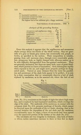 Keywords: The Quarterly journal of the Geological Society of London (13364989835).jpg 124 PROCEEDINGS OF THE GEOLOGICAL SOCIETY NoV <br> No ft in <br> 3 Laminated sandstone 5 4 <br> 2 Laminated arenaceous shale 3 <br> L Laminated sandstone 11 <br> The highest bed of the millstone grit a flaggy sandstone <br> Total thickness of coal-measures 1860 <br> Analysis of the preceding Section <br> ft in <br> Arenaceous and argillaceous shales 1127 3 <br> Underclays 99 6 <br> Sandstones 562 <br> Coal 37 <br> Bituminous shales 26 5 <br> Carbonaceous shales 3 3 <br> Limestones 3 11 <br> Conglomerate 8 <br> 1860 <br> Prom this analysis it appears tliat the argillaceous and arenaceous <br> shales occupy about two-thirds of the whole section ; they are gene- <br> rally of a grey or bluish grey colour but occasionally red purple or <br> brown as specified in the section Their composition is variable <br> passing from soft unctuous clays through every conceivable grade <br> into arenaceous beds so highly charged with siliceous matter as to <br> be with difficulty distinguished from fine-grained sandstones They <br> are generally laminated but there are many beds some of great thick- <br> ness which present no traces of lamination ; these disintegrate rapidly <br> when exposed to the air and might more properly perhaps be desig- <br> nated marls Viewed at some distance from the water the parallel- <br> ism and persistence of the shale beds appear to be perfect ; it is only <br> by a close examination that we occasionally discover a bed of shale <br> replaced by sandstone as in the annexed cut where the bed of red <br> Fig 1 <br> Sandstone Shale 215 <br> High- <br> water \ <br> line J <br> Shale 213 <br> Shale 214 <br> shale No 214 terminates at the height of eight feet above high- water <br> line and is replaced by hard laminated sandstone which overlaps the <br> edge of the shale The underside of the sandstone in contact with the <br> subjacent shale No 213 presents markings of fucoids which cannot <br> be observed upon the underside of the red shale showing that in the <br> interval between the deposition of the red shale and the sandstone <br> unconformably upon its edges a layer of sea-weeds had been spread <br> over the uncovered portion of the surface of the shale No 213 <br> The red shales are very irregular in thickness ; thin beds of twelve <br> or fifteen inches sometimes increase to three or four feet in depth 36933949 113689 51125 Page 124 Text v 6 http //www biodiversitylibrary org/page/36933949 1850 Geological Society of London Biodiversity Heritage Library The Quarterly journal of the Geological Society of London v 6 1850 Geology Periodicals Smithsonian Libraries bhl page 36933949 dc identifier http //biodiversitylibrary org/page/36933949 smithsonian libraries Information field Flickr posted date ISOdate 2014-03-23 Check categories 2015 August 26 CC-BY-2 0 BioDivLibrary https //flickr com/photos/61021753 N02/13364989835 2015-08-26 11 55 08 cc-by-2 0 PD-old-70-1923 The Quarterly journal of the Geological Society of London 1850 Photos uploaded from Flickr by Fæ using a script |