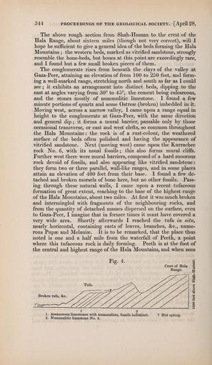 | Keywords: The Quarterly journal of the Geological Society of London (13206254374).jpg 344 <br> PROCEEDINGS OF THE GEOLOGICAL SOCIETY <br> April 28 <br> The above rough section from Shah-Hussan to the crest of the <br> Hala Range about sixteen miles though not very correct will I <br> hope be sufficient to give a general idea of the beds forming the Hala <br> Mountains ; the western beds marked as vitrified sandstone strongly <br> resemble the bone-beds but bones at this point are exceedingly rare <br> and I found but a few small broken pieces of them <br> The conglomerate rises from beneath the clays of the valley at <br> Gaza-Peer attaining an elevation of from 100 to 250 feet and form- <br> ing a well-marked range stretching north and south as far as I could <br> see ; it exhibits an arrangement into distinct beds dipping to the <br> east at angles varying from 30° to 45° the cement being calcareous <br> and the stones mostly of nummulitic limestone I found a few <br> minute portions of quartz and some Ostrese broken imbedded in it <br> Moving west across a narrow valley I came upon a range equal in <br> height to the conglomerate at Gaza-Peer with the same direction <br> and general dip ; it forms a mural barrier passable only by those <br> occasional transverse or east and west clefts so common throughout <br> the Hala Mountains the rock is of a rust-colour the weathered <br> surface of the beds often polished and having the appearance of <br> vitrified sandstone Next moving west came upon the Kurrachee <br> rock No 6 with its usual fossils ; this also forms mural cliifs <br> Further west there were mural barriers composed of a hard sonorous <br> rock devoid of fossils and also appearing like vitrified sandstone <br> they form two or three parallel wall-like ranges and in some places <br> attain an elevation of 400 feet from their base I found a few de- <br> tached and broken morsels of bone here but no other fossils Pass- <br> ing through these natural walls I came upon a recent tufaceous <br> formation of great extent reaching to the base of the highest range <br> of the Hala Mountains about two miles At first it was much broken <br> and intermingled with fragments of the neighbouring rocks and <br> from the quantity of detached masses dispersed on the surface even <br> to Gaza-Peer I imagine that in former times it must have covered a <br> very wide area Shortly afterwards I reached the tufa in situ <br> nearly horizontal containing casts of leaves branches c nume- <br> rous Pupse and Melanise It is to be remarked that the place thus <br> noted is one and a half mile from the waterfall of Peeth a point <br> where this tufaceous rock is daily forming Peeth is at the foot of <br> the central and highest range of the Hala Mountains and when seen <br> 1 Arenaceous limestones with numraulites fossils indistinct <br> 2 Nummulitic limestone No 8 <br> t Hot spring 36933103 113687 51125 Page 344 Text v 3 http //www biodiversitylibrary org/page/36933103 1847 Geological Society of London NameFound Hala NameConfirmed Hala EOLID 113195 NameBankID 4551297 Biodiversity Heritage Library The Quarterly journal of the Geological Society of London v 3 1847 Geology Periodicals Smithsonian Libraries bhl page 36933103 dc identifier http //biodiversitylibrary org/page/36933103 smithsonian libraries Information field Flickr posted date ISOdate 2014-03-17 Check categories 2015 August 26 CC-BY-2 0 BioDivLibrary https //flickr com/photos/61021753 N02/13206254374 2015-08-26 12 52 49 cc-by-2 0 PD-old-70-1923 The Quarterly journal of the Geological Society of London 1847 Photos uploaded from Flickr by Fæ using a script |