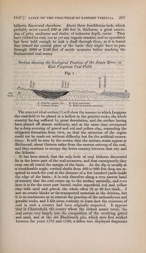 | Keywords: The Quarterly journal of the Geological Society of London (13205983323).jpg 184/ LYELL ON THE COAL-FIELD OF EASTERN VIRGINIA 2 53 <br> hitherto discovered elsewhere Above these fossiliferous beds which <br> probably never exceed 400 or 500 feet in thickness a great succes- <br> sion of grits sandstone and shales of unknown depth occur They <br> have yielded no coal nor as yet any organic remains and no speculator <br> has been bold enough to sink a shaft through them as it is feared <br> that toward the central parts of the basin they might have to pass <br> through 2000 or 2500 feet of sterile measures before reaching the <br> fundamental coal-seams <br> Section showing the Geological Position of the James Rive or <br> East Virginian Coal-Field <br> Fig 1 <br> A Granite gneiss Sec B Coal-measures <br> C Tertiary strata D Drift or m cient ullmnum <br> The annexed ideal section 1 will show the manner in which I suppose <br> the coal-field to be placed in a hollow in the granitic rocks the whole <br> country having suifered by great denudation and the surface having <br> been planed off almost uniformly and at the same time overspread <br> by a deep covering of gravel and red and yellow clay concealing the <br> subjacent formation from view so that the structure of the region <br> could not be made out without difficulty but for the artificial excava- <br> tions It will be seen by the section that the tertiary strata appear at <br> Richmond about thirteen miles from the eastern outcrop of the coal <br> and they continue to occupy the lower country between that city and <br> the Atlantic <br> It has been stated that the only beds of coal hitherto discovered <br> lie in the lower part of the coal-measures and that consequently they <br> crop out all round the margin of the basin As the dip is usually at <br> a considerable angle vertical shafts from 400 to 800 feet deep are re- <br> quired to reach the coal at the distance of a few hundred yards inside <br> the edge of the basin ; it is only therefore along a very narrow band <br> of country that the coal comes up to the surface naturally and even <br> here it is for the most part buried under superficial red and yellow <br> clay with sand and gravel the whole often 30 or 40 feet thick I <br> saw no erratic blocks or far-transported materials in the detritus but <br> it is so continuous as to conceal the junction of the carboniferous and <br> granitic rocks and I felt some curiosity to learn how the existence of <br> coal in such a country had been originally suspected It appears <br> that in Chesterfield the county where the richest seams occur the <br> coal enters very largely into the composition of the overlying gravel <br> and sand and at the old Blackheath pits which were first worked <br> between the years 1785 and 1790 a fallen tree displayed fragments 36933002 113687 51125 Page 263 Text v 3 http //www biodiversitylibrary org/page/36933002 1847 Geological Society of London Biodiversity Heritage Library The Quarterly journal of the Geological Society of London v 3 1847 Geology Periodicals Smithsonian Libraries bhl page 36933002 dc identifier http //biodiversitylibrary org/page/36933002 smithsonian libraries Information field Flickr posted date ISOdate 2014-03-17 Check categories 2015 August 26 CC-BY-2 0 BioDivLibrary https //flickr com/photos/61021753 N02/13205983323 2015-08-26 12 56 32 cc-by-2 0 PD-old-70-1923 The Quarterly journal of the Geological Society of London 1847 Photos uploaded from Flickr by Fæ using a script |