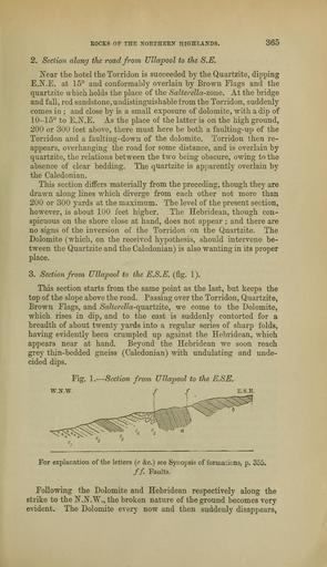 | Keywords: The Quarterly journal of the Geological Society of London (13204752175).jpg ROCKS OF THE NORTHERN HIGHLANDS 365 <br> 2 Section along the road from Ullapool to the S E <br> Near the hotel the Torridon is succeeded by the Quartzite dipping <br> E N E at 15° and conformably overlain by Brown Flags and the <br> quartzite which holds the place of the Salter -ella-zone At the bridge <br> and fall red sandstone un distinguishable from the Torridon suddenly <br> comes in ; and close by is a small exposure of dolomite with a dip of <br> 10-15° to E N E As the place of the latter is on the high ground <br> 200 or 300 feet above there must here be both a faulting-up of the <br> Torridon and a faulting-down of the dolomite Torridon then re- <br> appears overhanging the road for some distance and is overlain by <br> quartzite the relations between the two being obscure owing to the <br> absence of clear bedding The quartzite is apparently overlain by <br> the Caledonian <br> This section differs materially from the preceding though they are <br> drawn along lines which diverge from each other not more than <br> 200 or 300 yards at the maximum The level of the present section <br> however is about 100 feet higher The Hebridean though con- <br> spicuous on the shore close at hand does not appear ; and there are <br> no signs of the inversion of the Torridon on the Quartzite The <br> Dolomite which on the received hypothesis should intervene be- <br> tween the Quartzite and the Caledonian is also wanting in its proper <br> place <br> 3 Section from Ullapool to the E S E fig 1 <br> This section starts from the same point as the last but keeps the <br> top of the slope above the road Passing over the Torridon Quartzite <br> Brown Elags and /SVtZ r Z/a-quartzite we come to the Dolomite <br> which rises in dip and to the east is suddenly contorted for a <br> breadth of about twenty yards into a regular series of sharp folds <br> having evidently been crumpled up against the Hebridean which <br> appears near at hand Beyond the Hebridean we soon reach <br> grey th n-bedded gneiss Caledonian with undulating and unde- <br> cided dips <br> Fig 1 ” Section from Ullapool to the E SE <br> W N W / / E S E <br> For explanation of the letters c c see Synopsis of formations p 355 <br> // Faults <br> Following the Dolomite and Hebridean respectively along the <br> strike to the N N W the broken nature of the ground becomes very <br> evident The Dolomite every now and then suddenly disappears 36928972 113681 51125 Page 365 Text 39 http //www biodiversitylibrary org/page/36928972 1883 Geological Society of London Biodiversity Heritage Library The Quarterly journal of the Geological Society of London v 39 1883 Geology Periodicals Smithsonian Libraries bhl page 36928972 dc identifier http //biodiversitylibrary org/page/36928972 smithsonian libraries Information field Flickr posted date ISOdate 2014-03-16 Check categories 2015 August 26 CC-BY-2 0 BioDivLibrary https //flickr com/photos/61021753 N02/13204752175 2015-08-26 12 52 02 cc-by-2 0 PD-old-70-1923 The Quarterly journal of the Geological Society of London 1883 Photos uploaded from Flickr by Fæ using a script |