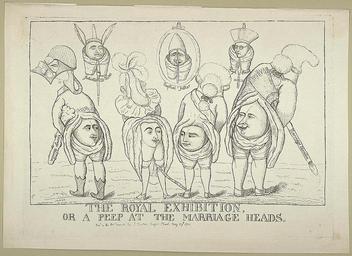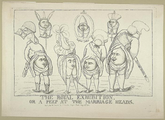 Keywords: The royal exhibition, or a peep at the marriage heads.jpg Print shows a rear view of Maria Anne Fitzherbert and the Prince of Wales as bride and groom they are connected by a ribbon on which is written honi soit qui mal y pense ; two figures also rear views look on Courage alamode from the left and Marriage alamode from the right Three rear view portraits hang on the wall in the background from left Justice Midas with the ears of a donkey Nuptial Father the Pope and as High Priest Edmund Burke LOC-image cph 3c32978 London Pub'd by J Carter Oxford Street 1786 May 29th Title from item Paper watermarked JWhatman DLC Attributed to William Dent Forms part of British Cartoon Prints Collection Library of Congress PD-Art 1786 cartoons Caricatures of popes |