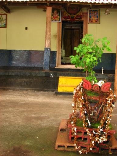 Keywords: The sanctum sanctorum of Kalakat Illam.jpg en This is the thulasi thara of Kalakat Illam At the back is the door to the sanctum sanctorum Own Myashu Statues of Hindu deities in Kerala