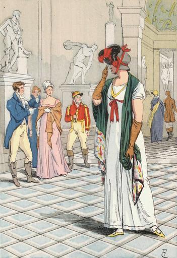 Keywords: The Sculpture Gallery in the Louvre Museum, 1806.jpg Artwork The Louvre was opened as a museum in 1793 and admission was free to the public on weekends The antique sculpture collection was added in 1800 into the former apartments of Anne of Austria or the petite galerie The woman in the foreground is wearing a châle cachmire or cashmere shawl These shawls imported from India were ironically made more popular after the 1806 continental embargo making cashmere shawls very expensive to obtain Her hat is a bonnet with feathers attached with a silk ribbon and was very popular during the time of Napoleon I 1898 colored plate 10 x 15 cm Institution Brown University Library object history exhibition history credit line Published in Octave Uzanne Fashion in Paris the various phases of feminine taste and aesthetics from 1797 to 1897 London William Heinemann 1898 accession number 1145807704968636 PD-old Les modes de Paris 024 Images of Paris from the Brown University Library 1806 in Paris Fashion in 1806 Musée du Louvre in art Regency revival genre paintings 1898 engravings |