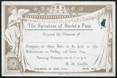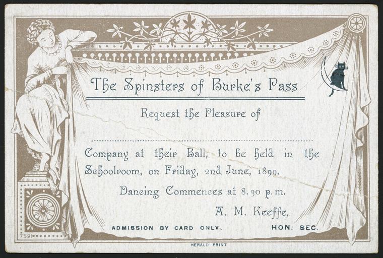 Keywords: text writing document drawing photo border Invitation card to a ball. The name of the invitee is not filled in. The border incorporates the figure of a woman holding up the announcement, and there is a black cat sitting on a new moon in the top right corner. Quantity: 1 colour art print(s). Physical Description: Engraving, on card 77 x 115 mm. Provenance: Purchased in 2005. Timaru herald (Newspaper). The Spinsters of Burke's Pass request the pleasure of ...... company at their ball, to be held in the Schoolroom, on Friday, 2nd June, 1899. Dancing commences at 8.30 p.m. A M Keeffe, Hon. Sec. Herald Print [1899]. Ref: Eph-A-BALL-1899-01. Alexander Turnbull Library, Wellington, New Zealand. natlib.govt.nz/records/23036567 Invitation card to a ball. The name of the invitee is not filled in. The border incorporates the figure of a woman holding up the announcement, and there is a black cat sitting on a new moon in the top right corner. Quantity: 1 colour art print(s). Physical Description: Engraving, on card 77 x 115 mm. Provenance: Purchased in 2005. Timaru herald (Newspaper). The Spinsters of Burke's Pass request the pleasure of ...... company at their ball, to be held in the Schoolroom, on Friday, 2nd June, 1899. Dancing commences at 8.30 p.m. A M Keeffe, Hon. Sec. Herald Print [1899]. Ref: Eph-A-BALL-1899-01. Alexander Turnbull Library, Wellington, New Zealand. natlib.govt.nz/records/23036567 |