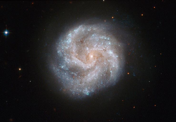 | Keywords: ic 391 ic391 black background lunar texture Hubble's Advanced Camera for Surveys has captured this moment in the ever-changing life of a spiral galaxy called IC 391. Although these massive star cities appear static and unchanging, their stellar inhabitants are constantly moving and evolving, with new stars being born and old stars reaching the ends of their lives —often in spectacular fashion, with an immense supernova explosion that can be viewed from Earth. On 3 January 2001, members of the Beijing Astronomical Observatory discovered such an explosion within IC 391 and it was named SN 2001B. This was a Type Ib supernova, which occurs when a massive star runs out of fuel for nuclear fusion and collapses, emitting vast amounts of radiation and creating a powerful shock wave. Hubble has contributed much to our understanding of supernovae in recent years, and it has made an extensive study of supernova 1987A (heic0704), the brightest such stellar explosion to be seen from Earth in over 400 years. IC 391 lies about 80 million light-years away in the constellation of Camelopardalis (the Giraffe) in the far northern part of the sky. The British amateur observer William Denning discovered it in the late nineteenth century, and described it as faint, small and round. This picture was assembled from images taken with Hubble’s Wide Field Channel on the Advanced Camera for Surveys. Images through a blue filter (F435W) were coloured blue, those through a green filter (F555W) are shown as green and those through a near-infrared filter (F814W) are shown in red. The exposure times were 800 s, 700 s and 700 s respectively and the field of view is 2.1 by 1.4 arcminutes. Hubble's Advanced Camera for Surveys has captured this moment in the ever-changing life of a spiral galaxy called IC 391. Although these massive star cities appear static and unchanging, their stellar inhabitants are constantly moving and evolving, with new stars being born and old stars reaching the ends of their lives —often in spectacular fashion, with an immense supernova explosion that can be viewed from Earth. On 3 January 2001, members of the Beijing Astronomical Observatory discovered such an explosion within IC 391 and it was named SN 2001B. This was a Type Ib supernova, which occurs when a massive star runs out of fuel for nuclear fusion and collapses, emitting vast amounts of radiation and creating a powerful shock wave. Hubble has contributed much to our understanding of supernovae in recent years, and it has made an extensive study of supernova 1987A (heic0704), the brightest such stellar explosion to be seen from Earth in over 400 years. IC 391 lies about 80 million light-years away in the constellation of Camelopardalis (the Giraffe) in the far northern part of the sky. The British amateur observer William Denning discovered it in the late nineteenth century, and described it as faint, small and round. This picture was assembled from images taken with Hubble’s Wide Field Channel on the Advanced Camera for Surveys. Images through a blue filter (F435W) were coloured blue, those through a green filter (F555W) are shown as green and those through a near-infrared filter (F814W) are shown in red. The exposure times were 800 s, 700 s and 700 s respectively and the field of view is 2.1 by 1.4 arcminutes. |