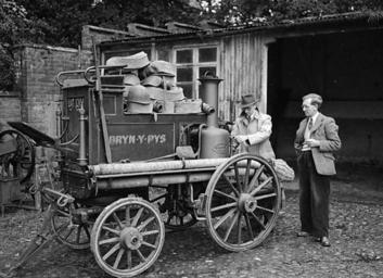 <b>Nodyn/Note:</b> Image of an old horse-drawn fire engine being examined by two men. After the death of Major Hugh Peel in 1950 the Bryn-y-Pys mansion was let and a large proportion of its contents sold.