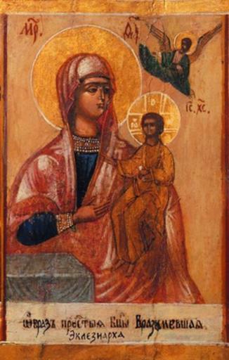 | Keywords: The taught of ekklisiarkh.jpg  Икона Божией  ате и «В азумившая экклисиа ха» Ф агмент иконы «Распятие и Ст асти Господни с изоб ажением 142 об азов Бого одицы» Кон XVIII  нач XIX в Богоявленский собо в Елохове  осква http //www pravenc ru/text/155404 html XVIII c anonimus Hodegetria PD-Art |
