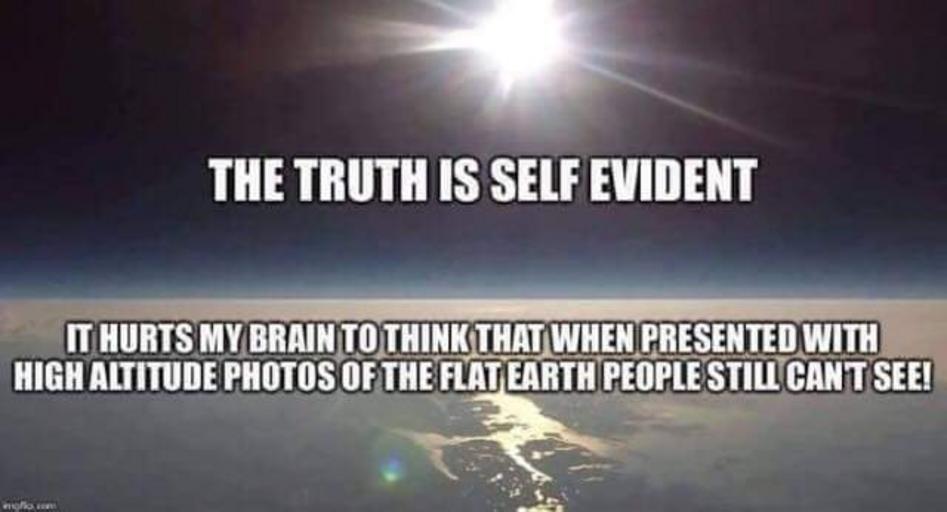 | Keywords: truth altitude balloon nasa news flatearth flat earth space hoax sun moon yin yang yinyang god reality plane universe curve curvature nocurve bible dome The truth is self evident. It hurts my brain to think that when presented with high altitude photos of the flat earth people still can't see! FlatEarth meme collected by A.J. Wilson of iPressThis at FlatEarth.Online, made by others. The truth is self evident. It hurts my brain to think that when presented with high altitude photos of the flat earth people still can't see! FlatEarth meme collected by A.J. Wilson of iPressThis at FlatEarth.Online, made by others. |