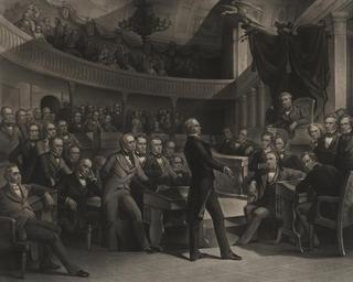 | Keywords: The United States Senate, A.D. 1850, by Peter F. Rothermel (crop2).jpg LargeImage This engraving depicts the Golden Age of the United States Senate in the Old Senate Chamber site of many of the institution's most memorable events Here Henry Clay the Great Compromiser introduces the Compromise of 1850 in his last significant act as a senator In a desperate attempt to prevent war from erupting the Great Triumvirate of Daniel Webster of Massachusetts John C Calhoun of South Carolina and Clay of Kentucky struggled to balance the interests of the North South and West This image shows all three men with Clay at center stage presenting his compromise to the Senate Daniel Webster is seated to the left of Clay and John C Calhoun to the left of the Speaker's chair c 1855 Carl Schurz Life of Henry Clay Boston Houghton Mifflin Co 1899 Vol 2 facing p 226 object history exhibition history credit line DRAWN BY P F ROTHERMEL Entered according to Act of Congress in the year 1855 by John M Butler and Alfred Long in the Clerks Office of the District Court of the United states in and for the Eastern District of Pennsylvania ENGRAVED BY R WHITECHURCH THE UNITED STATES SENATE A D 1850 This Engraving from the Original Picture is respectfully dedicated to the People of the United States by the Publishers John M Butler and Alfred Long 84 CHESTNUT ST PHILADELPHIA PA accession number LOC-image ppmsca 09398 place of creation Published Philadelphia Pa John M Butler and Alfred Long c1855 The United States Senate A D 1850 by Peter F Rothermel jpg 150 Other versions all based on the same full resolution image from the Library of Congress <gallery widths 120 heights 95 > File The United States Senate A D 1850 by Peter F Rothermel jpg Full resolution original image from LOC File The United States Senate A D 1850 by Peter F Rothermel crop1 jpg Full resolution cropped to frame/border and cleaned up a little </gallery> Also see Category The United States Senate A D 1850 by Peter F Rothermel Caption Collapse top Engraving with the caption transcribed and rendered in markup 0 cellspacing 0 style text-align center; white-space nowrap; background-color E4E0D6; color 333333; font-family arial sans-serif; border solid 2px aaaaaa; - 3 <div style padding 55px 70px 0 70px; >1420px</div> - font-size 10px; text-align left; padding-left 72px; DRAWN BY P F ROTHERMEL font-size 9px; Entered according to Act of Congress in the year 1855 by John M Butler and Alfred Long in the Clerks Office of the District Court of the United states in and for the Eastern District of Pennsylvania font-size 10px; text-align right; padding-right 72px; ENGRAVED BY R WHITECHURCH - 3 style font-size 28px; font-family 'Palatino Linotype' serif; letter-spacing 3px; padding-top 6px; THE UNITED STATES SENATE A D 1850 - 3 style font-size 18px; padding 6px 0 6px 0; font-family 'times new roman' serif; This Engraving from the Original Picture is respectfully dedicated to the People of the United States by the Publishers - 3 style font-size 11px; padding-bottom 6px; JOHN M BUTLER AND ALFRED LONG 84 CHESTNUT ST PHILADELPHIA PA Collapse bottom PD-old-100-1923 The United States Senate A D 1850 by Peter F Rothermel |