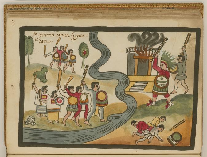 Keywords: The War against Coyoacan WDL6729.png Artwork ru Това Хуан де около 1546 г около 1626 г fr Tovar Jean de 1546-1626 env en Tovar Juan de circa 1546-circa 1626 zh 胡安·德·托瓦尔,约 1546 年 - 约 1626 年 pt Tovar Juan de por volta de 1546-por volta de 1626 ar خوان دو توفار، حوالي 1546-حوالي 1626 es Tovar Juan de circa 1546-circa 1626 ru Война с Койоаканом fr La guerre de Coyoacan en The War against Coyoacan zh 科约阿 战争 pt A guerra contra Coyoacan ar الحرب ضد كُوْيْواكان ru Кодекс Това а авто ом кото ого считается мексиканский иезуит XVI века Хуан де Това соде жит под обную инфо мацию об об ядах и це емониях ацтеков известных также как мешика Кодекс п оиллюст и ован 51 аква ельным исунком на полную ст аницу Рисунки в кото ых наблюдается значительное влияние пиктог афических укописей доколониальных в емен обладают исключительными художественными достоинствами Рукопись состоит из т ех азделов В пе вом азделе описана исто ия путешествий ацтеков до п ибытия испанцев Вто ой аздел п едставляющий собой иллюст и ованную исто ию ацтеков составляет основной объем укописи В т етьем азделе находится календа ь Това а а этой иллюст ации из вто ого аздела изоб ажена битва п и Койоакане Воо уженные дубинками и щитами воины с ажаются пе ед го ящим х амом Воины некото ые из них женщины стоят на бе егах еки Рядом видны дубинки символ холма вид сбоку и ме твые воины а полководце головной убо с пе ьями возможно птицы кетцаль Ученый Жак Лафайе едакто факсимильного издания укописи Това а п едполагал что возможно военачальником является Тлакаелель <br>Ацтеки; С ажения; Кодекс; Индейцы ексики; Ко енные на одности; езоаме ика; Солдаты; Кодекс Това а fr Le codex Tovar attribué à Jean de Tovar jésuite mexicain du XVI<sup>e</sup> siècle contient des informations détaillées sur les rites et les cérémonies des Aztèques également connus sous le nom de Mexicas Il est illustré de 51 aquarelles de la taille d'une page Fortement influencées par les manuscrits pictographiques de la période précontact ces peintures sont d'une qualité artistique exceptionnelle Le manuscrit est divisé en trois sections La première section contient une histoire des voyages des Aztèques avant l'arrivée des Espagnols La seconde section une histoire illustrée du peuple aztèque constitue la majeure partie du manuscrit La troisième section est constituée du calendrier de Tovar Cette illustration extraite de la seconde section représente la bataille de Coyoacan Des soldats se battent avec des massues de guerre et des boucliers devant un temple en train de brûler Ces soldats dont certains sont des femmes se tiennent sur les rives d'un fleuve Des massues de guerre le glyphe d'une colline vu de côté et des soldats morts sont également dessinés Le chef des soldats porte une coiffe à plumes de quetzal L'érudit Jacques Lafaye éditeur de la version fac-similé du manuscrit de Tovar émit l'hypothèse selon laquelle le chef de ces soldats était Tlacaelel <br>Aztèques; Batailles; Codex; Indiens du Mexique; Peuples autochtones; Méso-Amérique; Soldats; Codex Tovar en The Tovar Codex attributed to the 16th-century Mexican Jesuit Juan de Tovar contains detailed information about the rites and ceremonies of the Aztecs also known as Mexica The codex is illustrated with 51 full-page paintings in watercolor Strongly influenced by pre-contact pictographic manuscripts the paintings are of exceptional artistic quality The manuscript is divided into three sections The first section is a history of the travels of the Aztecs prior to the arrival of the Spanish The second section an illustrated history of the Aztecs forms the main body of the manuscript The third section contains the Tovar calendar This illustration from the second section depicts the Battle of Coyoacan Soldiers are shown fighting with war clubs and shields before a burning temple Soldiers some of them women stand on the banks of a river Also shown are war clubs the glyph of a hill shown from the side and dead soldiers The chief soldier wears a feathered or quetzal headdress The scholar Jacques Lafaye the editor of the facsimile edition of the Tovar manuscript hypothesized that the leader of the soldiers might be Tlacaélel <br>Aztecs; Battles; Codex; Indians of Mexico; Indigenous peoples; Mesoamerica; Soldiers; Tovar Codex zh 这 托瓦尔手抄 被认为是 16 世纪墨西哥 稣会士胡安·德·托瓦尔 Juan de Tovar ,其中包含关于阿兹特克(也称墨西卡)礼仪和仪式的详细信息 手抄 中 51 整页的水彩画 这些画 受到与外界接触前的象形手稿的巨大影响,具 极高的艺 品质 手稿分为三个部分 第 部分介绍西班牙人到 之前,阿兹特克人的迁徙历史 第二部分是手稿的主体部分,以图画介绍了阿兹特克人的历史 第三部分包含托瓦尔日历 这幅插图 自第二部分,描绘了发生 科约阿 的战争 士兵们正手持粗棍棒和盾牌 座燃