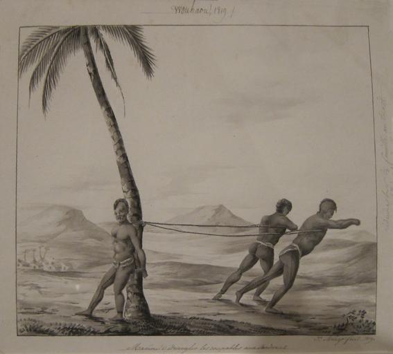 Keywords: 'The Way of Strangling the Guilty in the Sandwich Islands' by Jacques Arago.jpg en The Way of Strangling the Guilty in the Sandwich Islands graphite pen ink and grey wash on paper by Jacques Etienne Victor Arago 1819 Honolulu Museum of Art accession 25708 own Hiart 1819 PD-Art-100 1819 in art Native Hawaiians in art Art of Hawaii in the Honolulu Museum of Art Arago Hawaii in the 1810s Drawings by Jacques Arago Ink drawings Hawaii in drawings Tattoos of Hawaii Executions in art Garrote Execution by strangulation |