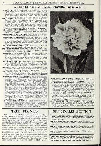 Keywords: The wonderful new rose hoosier beauty (16387831672).jpg 16 <br> ELLA V BAINES THE WOMAN FLORIST SPRINGFIELD OHIO <br> A LIST OF THE CHOICEST PEONIES ” Concluded <br> 275 ” L'INDISPENSABLE ” It is a huge ball of del- <br> icate baby-pink Has by far the most petals <br> of any Peony in our collection On the Pacific <br> slope this is said to stand at the head of the list <br> of all varieties The past June it was as fine a <br> Peony as any in our entire collection 35 cents <br> 135 ” LINNE ” Large globular compact bloom <br> Color Tyrian-rose; guards slightly necked with <br> crimson; quite floriferous At a reception held <br> in Springfield a lot of Linne cut with three and <br> a half foot stems placed in a vase four feet in <br> height was more admired than any variety dis- <br> played and there were some three thousand <br> Peony blooms used It is a wonder 50 cents <br> 82 ” LOUIS VAN HOXJTTE ” Very fine shapely <br> bloom; color bright violaceous red of dazzling <br> effect 35 cents <br> 138 ” MADAME BUCQUET ” Color velvety crimson <br> almost black; very rich and magnificent 50 cts <br> 32 ” MADAME FOREL ” Enormous very full dou- <br> ble bloom; color glossy deep pink with a silvery <br> reflex; known as the Princess of Pink Peonies <br> a title it well deserves and proudly carries Al- <br> most as large as the famous Monsieur Jules <br> Elie Extra fine 50 cents <br> 39 ” MARECHAL VALLIANT ” Immense globes of <br> clear red with shades of mauve 50 cents <br> 276 ” MARGUERITE GERARD ” Color delicate pink <br> changing as the flower ages to creamy- white; <br> a sensational flower 75 cents <br> 31 ” MARIE LEMOINE ” The flowers are enormous <br> and massive often eight to ten inches across <br> Color ivory-white with occasional narrow car- <br> mine tracing on edge of some petals A sort <br> the Peony enthusiast raves over and well he <br> may 35 cents <br> 10 ” MARIE STUART ” The color is a delicate lav- <br> ender flecked with cerise Our field plot of Marie <br> Stuart in bloom is surely a carpet fit for the <br> feet of angels to tread 50 cents <br> 246 ” MASTERPIECE ” Brilliant Tyrian-rose; free <br> bloomer A very distinct and beautiful variety <br> Fine tall grower; fragrant 75 cents <br> 35 ” MEISSONIER ” Very brilliant crimson called <br> in the Chicago market the American Beauty <br> Peony as it resembles that Rose in color 50 cents <br> 48 ” MONSIEUR JULES EL D3 ” This is the king of <br> all Peonies and is without question M Crousse's <br> masterpiece Immense globular very full <br> flowers Color an ideal glossy lilac-pink shad- <br> ing to deeper rose at the base the entire flower <br> overlaid with a sheen of silver that fairly shim- <br> mers in the sunlight Monsieur Jules Elie is <br> claimed by many to be the largest of all Peony <br> flowers On young vigorous plants we have <br> had flowers eight and nine inches through In <br> fact they are so large and handsome that but <br> few can realize they are Peony blossoms on first <br> seeing them An unapproachable variety from <br> any standpoint When cut in the bud a good <br> keeper thus fine for cut flowers Our planting <br> comprises some twenty thousand plants of this <br> grand Peony Easily scores the six points of <br> excellence 75 cents <br> 6 ” MONSIEUR KRELAGE ” Deep currant or sol- <br> ferino-red with amaranthine center The French <br> hybridists evidently spilled their paint pot <br> after producing this superb variety as there is <br> nothing in Peonies of its color 50 cents <br> ffHWI'fjMh <br> 51 ” PRESIDENT ROOSEVELT ” It is a deep rich <br> brilliant red in color different from any red we <br> know and a grand Peony 75 cents <br> 50 ” PRINCESS BEATRICE ” Large compact high <br> built crown Guards delicate lilac-rose collar <br> creamy-white with shades of amber Crown of <br> brilliant sea-shell pink the extreme center <br> flecked crimson A glorious flower a very <br> splendor of fragrant loveliness; free bloomer <br> fragrant Unquestionably the best of all the <br> tricolor Peonies Simply exquisite 50 cents <br> 40 ” QUEEN VICTORIA ” The very best every day <br> white When cut a first rate keeper Flower <br> of good substance and color; very pretty in the <br> bud state when it has a faint blush tint; an old <br> standby 35 cents <br> 181 ” TRIOMPHE DE EXPOSITION DE LILLE ” <br> Large compact bloom of a fresh bright pink <br> Splashed with darker tints of violet-rose and <br> with white reflex This is one of our favorite <br> Peonies 75 cents <br> TREE PEONIES <br> This is a remarkable species developed from <br> Peony Mouton a native of China and Japan In <br> habit of growth it is not unlike a deciduous shrub <br> ” the growths are short and stocky the plant <br> eventually attaining a height of four or more feet <br> and of large circumference; the foliage is quite <br> handsome and the immense flowers which usually <br> appear some two weeks ahead of the herbaceous <br> class are most remarkable for their immense size <br> and gorgeous colorings Splendid for grouping or <br> for specimen plants on lawns While a hardy plant <br> it will be found desirable to give it some protection <br> in very cold latitudes All shoots springing from <br> the base should be rubbed off We offer any color <br> desired our choice of varieties only at 1 25 each <br> OFFICINALIS SECTION <br> These are earlier hloomers than the Chinensis sec- <br> tion They are the old May-flowering Peonies of <br> our mothers' gardens Price 50 cents each; the <br> three for 1 25 <br> OFFICINALIS RUBRA PI PI ” The old-fashioned <br> early deep crimson variety of our grandmothers' <br> gardans <br> OFFICINALIS ROSEA Fl PI ” Very large well- <br> formed bloom; color deep pink; very brilliant <br> and effective <br> OFFICINALIS ALBA Mntabilis ” White Striped <br> with pink <br> Ppmomhpr That so long as we can ship Peonies <br> rVCllldllUd safely during the