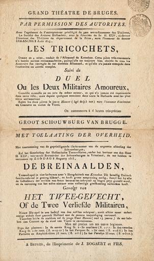 Keywords: Théâtre Bruges 1813.jpg nl Aankondiging van een toneelopvoering door het gezelschap De Hollandsche Toonneellisten in de schouwburg van Brugge België op zondag 8 augustus 1813 met twee stukken van August von Kotzebue Die Stricknadeln De Breinaalden en Das Duell Het Duel en Announcement of a theatrical performance by the Hollandsche Toonneellisten in the theater of Bruges Belgium on Sunday 8 August 1813 performing two pieces by August von Kotzebue Die Stricknadeln The knitting needles and Das Duell The Duel fr Annonce d'une représentation par la troupe des Hollandsche Toonneellisten au théâtre de Bruges Belgique le dimanche 8 août 1813 de deux pièces d'August von Kotzebue Die Stricknadeln Les aiguilles à tricoter en Das Duell Le duel 2015-05-25 23 25 20 private collection scanned by Marc Ryckaert please mention Collection Marc Ryckaert other versions PD-old Uploaded with UploadWizard Theaters in Bruges August von Kotzebue Images by MJJR |