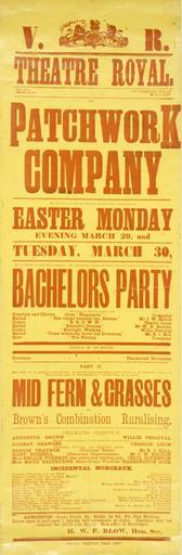 Keywords: text writing Arrangement of text. Dramatis Personae. Augustus Brown, Willie Percival, D'Orsay Granger, Charlie Leon, Bertie Traynor, E. J. Hill, Hart Russell, J. W. Hilton, Miss Nellie Forrest, Cecil Riverton, Miss Maude Eastburne, Harrington Aide. Quantity: 1 colour art print(s). Physical Description: Letterpress, red on yellow 865 x 282 mm. Provenance: Donated by Mrs E E Hill, Lower Hutt, in November 1974. Hill, E E (Mrs), fl 1974. Theatre Royal :The Patchwork Company have the honour to announce that they will make their re-appearance on Easter Monday Evening, March 29 and Tuesday March 30...an entirely new and original white face sketch, entitled the Bachelors Party...Part II,.. Mid Fern and Grasses, or Brown's combination ruralising...H. W. P Blow, Hon Sec. Evening Chronicle Steam Print [1880].. Ref: Eph-E-VARIETY-1880-01. Alexander Turnbull Library, Wellington, New Zealand. natlib.govt.nz/records/22725211 Arrangement of text. Dramatis Personae. Augustus Brown, Willie Percival, D'Orsay Granger, Charlie Leon, Bertie Traynor, E. J. Hill, Hart Russell, J. W. Hilton, Miss Nellie Forrest, Cecil Riverton, Miss Maude Eastburne, Harrington Aide. Quantity: 1 colour art print(s). Physical Description: Letterpress, red on yellow 865 x 282 mm. Provenance: Donated by Mrs E E Hill, Lower Hutt, in November 1974. Hill, E E (Mrs), fl 1974. Theatre Royal :The Patchwork Company have the honour to announce that they will make their re-appearance on Easter Monday Evening, March 29 and Tuesday March 30...an entirely new and original white face sketch, entitled the Bachelors Party...Part II,.. Mid Fern and Grasses, or Brown's combination ruralising...H. W. P Blow, Hon Sec. Evening Chronicle Steam Print [1880].. Ref: Eph-E-VARIETY-1880-01. Alexander Turnbull Library, Wellington, New Zealand. natlib.govt.nz/records/22725211 |