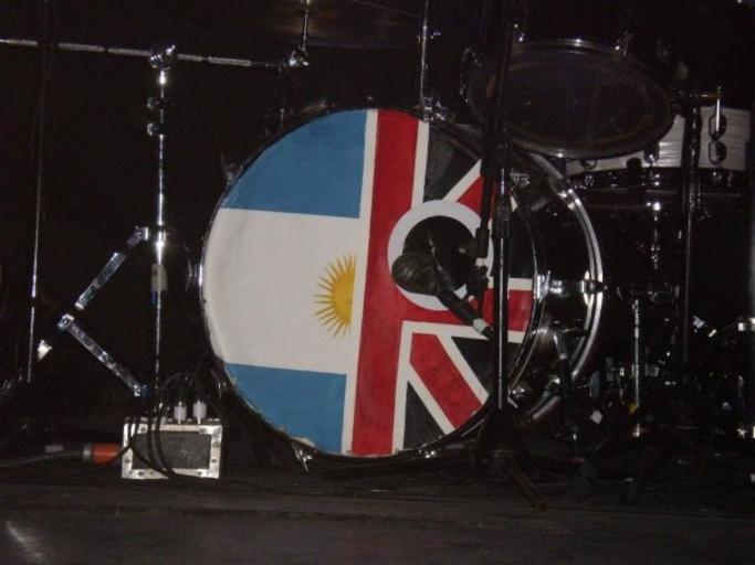 Keywords: Thedraytones.jpg en Photo of drumkit with hybrid Argentine-UK flag the draytones logo Own Sainttummy 2009-01-25 my picture Drum-kits Hybrid flags Kick drums Drum heads with holes