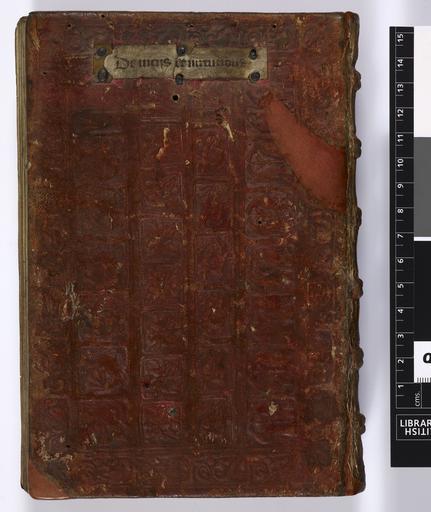 | Keywords: THEOLOGICAL and ethical compilations, viz.- Part 1. "Auctoritates pro virtutibus contra vitia" (so the modern title on the back) - a collection of biblical texts suitable for texts of sermon - Lower cover (Add Ms 38820).jpg Style Single tools design Romanesque; Caption Lower cover; Colour Red; Edge Unspecified exhibition history Decorative Technique Tooled in blind; Cover Material Sheep Contemporary binding of heep-skin dyed red over oak boards stamped in small square panels with fleurs-de-lys and heraldic beasts and birds within a narrow border of hippocamps with floriated tails On the lower cover is nailed a vellum label inscribed De viciis et virtutibus Note of ownership on f iv 14th cent Iste liber debet reverti ad conventum sancti Martini Tornacensis the Benedictine abbey of St Martin's Tournai Phillipps MS 2144 sale-cat 1896 lot 1065 Afterwards belonged to Henry White sale-cat 1902 lot 1964 Dunn sale-cat 1914 lot 1587 object history Text 13c; Unspecified; Unspecified object type Cc-zero place of creation Binding Not known place of discovery Unspecified British Library image http //www bl uk/catalogues/bookbindings/LargeImage aspx RecordId 020-000015344 ImageId ImageId 54811 Copyright BL THEOLOGICAL and ethical compilations viz Part 1 Auctoritates pro virtutibus contra vitia so the modern title on the back a collection of biblical texts suitable for texts of sermons a section de tempore and de sanctis including St Francis is at the end of pt ii ff 46-59 divided into five chief parts Vellum; ff viii + 225 71/2 in x 5 in Second half of XIII cent Uploaded with GWToolset THEOLOGICAL and ethical compilations viz Part 1 Auctoritates pro virtutibus contra vitia so the modern title on the back a collection of biblical texts suitable for texts of sermon - Lower cover Add Ms 38820 http //www webarchive org uk/bldatasets/bindings/Add38820_BC jpg Bookbinding 13th-century bookbinding British Library Bookbindings Taken with Phase One P45+ |