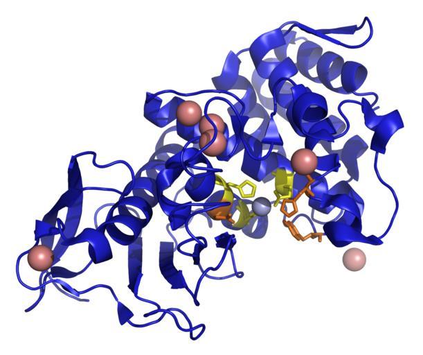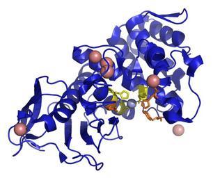 Keywords: Thermolysin 2A7G.png en ribbon model of thermolysin with zinc binding amino acids in yellow other amino acids important for catalysis in orange; zinc is light blue the six calcium are in salmon From PDB 2A7G Ref C Mueller-Dieckmann et al 2005 On the routine use of soft X-rays in macromolecular crystallography Part III The optimal data-collection wavelength Acta Crystallogr D Biol Crystallogr 61 1263-1272 PMID 16131760 DOI 10 1107/S0907444905021475 adapted from http //www pdb org/pdb/files/2a7g pdb using PyMOL Ayacop 2008-11-14 http //www ebi ac uk/pdbsum/2A7G Thermolysin Protein structures from PDB |