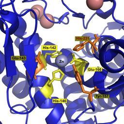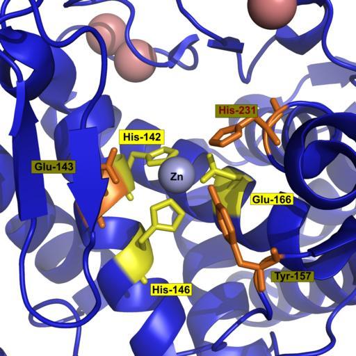 Keywords: Thermolysin detail 2A7G.png en detail of ribbon model of thermolysin with zinc binding amino acids in yellow other amino acids important for catalysis in orange; zinc is light blue the six calcium are in salmon From PDB 2A7G Ref C Mueller-Dieckmann et al 2005 On the routine use of soft X-rays in macromolecular crystallography Part III The optimal data-collection wavelength Acta Crystallogr D Biol Crystallogr 61 1263-1272 PMID 16131760 DOI 10 1107/S0907444905021475 adapted from http //www pdb org/pdb/files/2a7g pdb using PyMOL Ayacop 2008-11-14 http //www ebi ac uk/pdbsum/2A7G Thermolysin Protein structures from PDB |