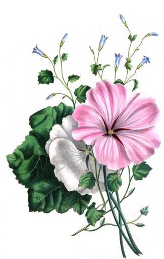 | Keywords: TheRomanceOfNature 0219.jpg Scan from book Painting of Campanula hederacea blue-bell Lavatera arborea mallow http //archive org/details/TheRomanceOfNature Internet Archive 1836 Creator Louisa Anne Meredith PD-old-100 The Romance of Nature Unidentified Campanula Malva eriocalyx |