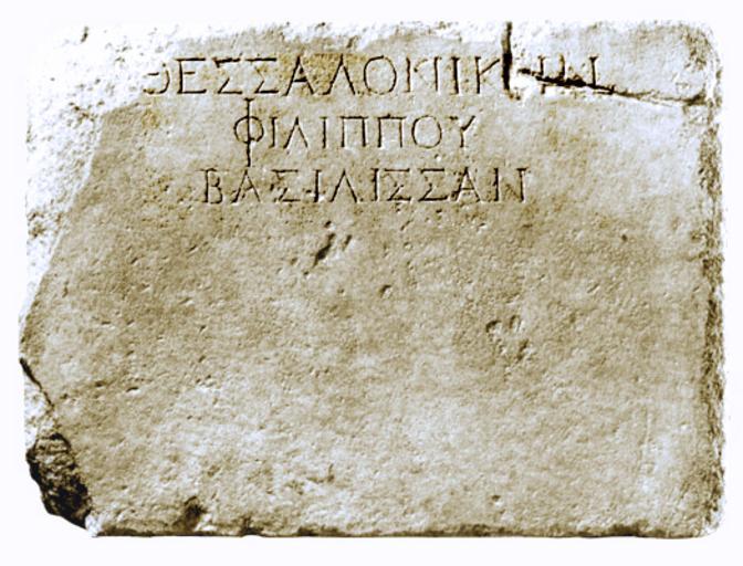 | Keywords: Thessaloniki-ancient inscription.png Inscribed base of a statue of Thessaloniki of the 2nd c B C found in the area of the ancient Agora and part of a group of statues of the family of Alexander the Great Inscription ΘΕΣΣΑΛΟ ΙΚΗ ΦΙΛΙΠΠΟΥ ΒΑΣΙΛΙΣΣΑ Ενε ίγραφο βάθρο αγάλματος της Θεσσαλονίκης Πρόκειται για τμήμα βάθρου με αγάλματα της οικογένειας του Φιλί ου Β΄ ου είχαν στηθεί εκεί το 2ο αι μ Χ Ένα α ό αυτά σύμφωνα με την ε ιγραφή εικόνιζε τη Θεσσαλονίκη κόρη του Φιλί ου και γυναίκα του Κασσάνδρου ου έδωσε το όνομά της στην όλη Ε ιγραφή ΘΕΣΣΑΛΟ ΙΚΗ ΦΙΛΙΠΠΟΥ ΒΑΣΙΛΙΣΣΑ own Philly boy92 2nd century BC PD-old-100 cc-by-sa-3 0 2 5 2 0 1 0 GFDL Ancient Greek inscriptions in the Archaeological Museum Thessaloniki 2nd-century BC inscriptions in Greece 2nd-century BC art in Thessaloniki Philip II |