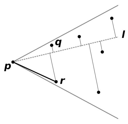 Keywords: Theta-cone.svg en An example of a cone in a theta-graph showing the orthogonal projection line and the edge which will ultimately be included in the graph own Gbint 2013-03-22 Computational geometry Cc-zero