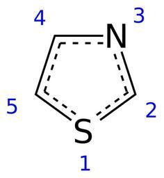 | Keywords: Thiazole 2D numbered aromatic.svg Skeletal formula of thiazole with the numbering convention for substituent groups showing the delocalized aromatic bond as a dotted line 2012-09-27 own Jynto Other fields C 1 + cc-zero Images by Jynto thiazole chemical structures to explain nomenclature |