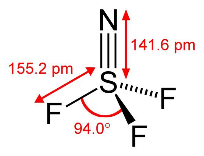 Keywords: Thiazyl-trifluoride-2D-dimensions.png Structural formula with dimensions of the thiazyl trifluoride molecule NSF<sub>3</sub> Own 2007-10-12 Ben Mills Benjah-bmm27 - Images by Ben Mills Thiazyl trifluoride