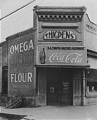 | Keywords: ThigpensMarionAlabamaWalkerEvans.jpg  Thigpen's Marion Alabama 1936 Photo of H G Thigpen Groceries Hardwear by Walker Evans Photograph by Walker Evans via <br> LOC-image fsa 8c52274 Converted from TIFF to jpg and border cropped before uploading 1936-08 Walker Evans for the Farm Security Administration / Office of War Information / Office of Emergency Management / Resettlement Administration Most photographs in this collection were taken by photographers working for the U S Government Work by the U S Government is not eligible for copyright protection http //www loc gov/rr/print/res/071_fsab html PD-USGov Walker Evans FSA-OWI Grocery stores in Alabama 1936 in Alabama Hardware stores in the United States Outdoor advertising in the United States Marion Alabama Brick buildings in Alabama Buildings in Perry County Alabama Coca-Cola signs |