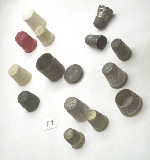 Keywords: ThimblesBedfordMuseum.JPG en A group of thimbles on display in Bedford Museum In the middle of the group is a thimble box with its lid own Simon Speed 2010-09-15 Photos by Simon Speed Bedford Museum Bedford Thimbles