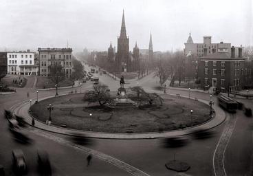 | Keywords: Thomas Circle - Washington, D.C..jpg Looking north past Thomas Circle in Washington D C as viewed from the Portland Flats demolished; built in 1880 and designed by Adolf Cluss; city's first apartment building The traffic circle is located at the junction of 14th Street visible on the lower right and center left Massachusetts Avenue right and left sides Vermont Avenue lower left and center right and M Street bottom right and bottom left NW The equestrian statue seen in this image was erected in 1879 and honors General George Henry Thomas The streetcar lines wrapping around the Circle on 14th Street were installed in the 1890s but no longer exist The homes visible on either side of the Circle have been demolished National City Christian Church designed by John Russell Pope in 1930 now stands on the Circle's west side and is a contributing property to the Greater Fourteenth Street Historic District The Wylie House seen on the right was demolished in 1947 and replaced with the nine-story Washington Plaza Hotel designed by Morris Lapidus The taller church seen directly across the Circle is Luther Place Memorial Church originally known as Memorial Evangelical Lutheran Church built in 1873 and listed on the National Register of Historic Places A statue honoring Martin Luther is located in front of the church It was a gift from the German emperor in 1884 and is a replica of the Martin Luther statue in Worms Germany Directly behind Luther Place is Mount Olivet Lutheran Church a contributing property to the Logan Circle Historic District The building was constructed in 1884 and originally home to the Vermont Avenue Christian Church original name for the National City Christian Church Mount Olivet purchased the property in 1953 The two remaining landmarks that can be seen in this image include Vermont Avenue Baptist Church look NW on Vermont; the steeple is visible and John Wesley AME Zion Church look north on 14th Street; the steeple is also visible Both buildings are contributing properties to the Greater Fourteenth Street Historic District npcc 30408 1922 National Photo Company PD-USGov Thomas Circle 1922 in Washington D C Martin Luther Statue Washington D C Luther Place Memorial Church Demolished buildings in Washington D C National Register of Historic Places in Washington D C Historic district contributing properties in Washington D C Trams in Washington D C 1920s automobiles George Henry Thomas Memorial 1922 in tram transport Black and white photographs of tram transport |