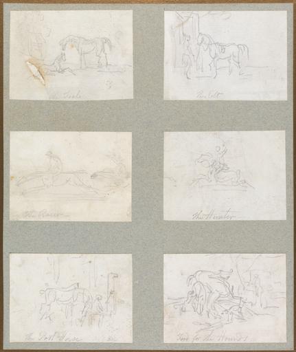 | Keywords: Thomas Rowlandson - Ages of the Horse- The Foal, The Colt, The Racer, The Hunter, The Post-Horse, Food for the Hounds - Google Art Project.jpg Inscribed in graphite top left image lower center The Foal ; in graphite top right image lower left The Colt ; in graphite middle left image lower left The Racer ; in graphite middle right image lower center The Hunter ; in graphite bottom left image lower left The Post Horse ; in graphite bottom right image lower left Food for the Hounds Inscription _Signed_and_Dated Not signed not dated Not on View Graphite on medium slightly textured cream laid paper mounted on very thick moderately textured blue wove paper hounds dogs horses animals jockeys sporting art special url_id gAFHVzyXIbcp0w PD-old-100-1923 1827 Drawings and watercolours by Thomas Rowlandson Google Art Project works by Thomas Rowlandson Drawings of horses |